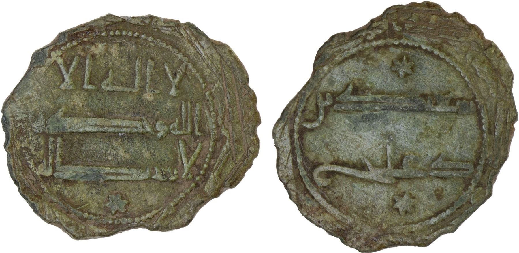 ABBASID: AE fals (1.87g) (Tabaristan), AH160, A-337, date sufficiently legible; citing the governor Sa'id b. Da'laj in the reverse field, who struck silver half drachms (types A-58 and 59); lovely gray-green patina, VF, R.