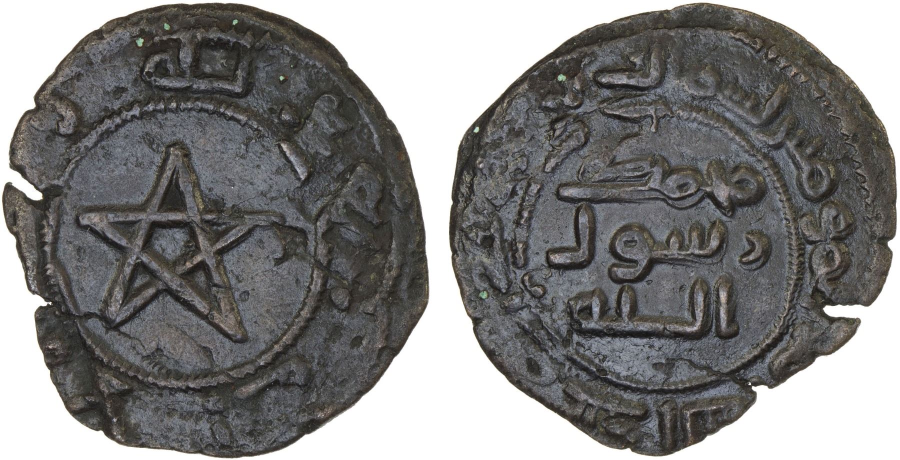 ABBASID: AE fals (2.51g), NM, ND, A-295, 5-pointed star, la ilah illa Allah wahduhu around, // with reference to the Abbasid caliph al-Saffah ('Abd Allah): bism Allah 'abd Allah 'abd Allah amir al-mu'minin around, with rest of the kalima in the center, VF, RRR. Without mint name, but the style suggests the mint of al-Mawsil.