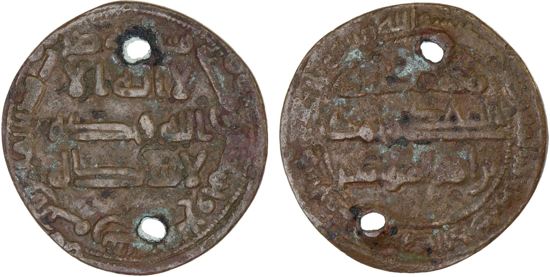ABBASID: AE fals (2.80g), al-Yaman, AH157, A-313N, cf. Zeno-248116, in the name of al-Mahdi as heir apparent to the caliphate, known dated all years AH156-158; pierced twice, F-VF, RRR.