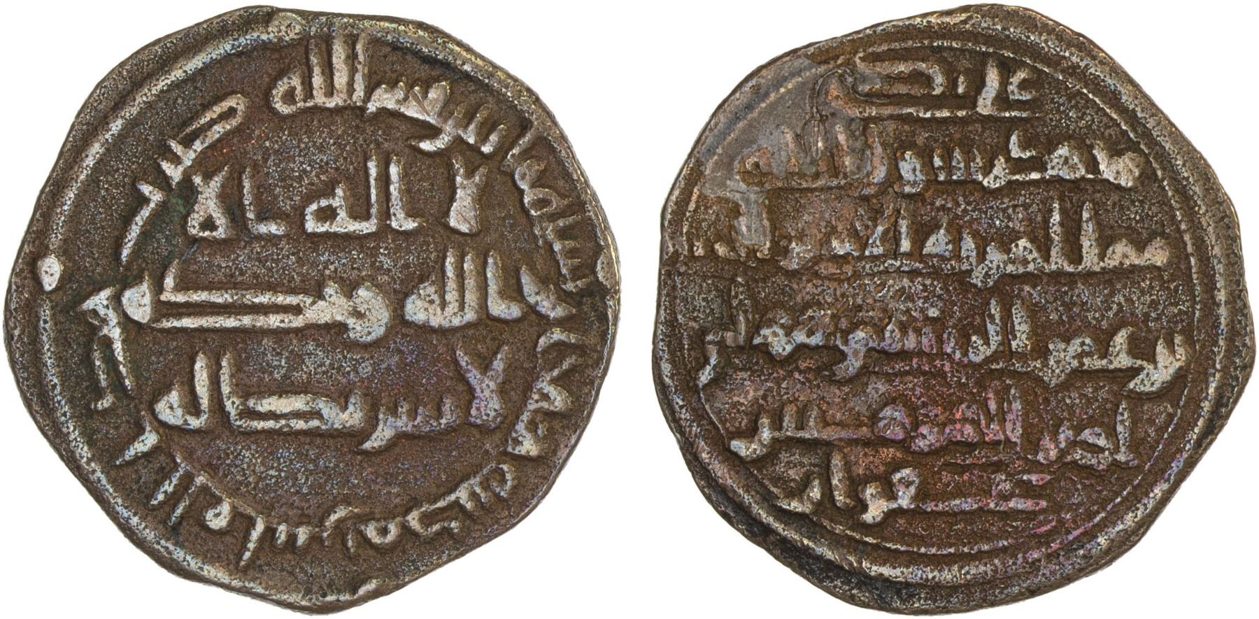 ABBASID: AE fals (2.89g), Hamadan, AH200, A-322, Miles-402, in the name of the governor al-Husayn b. 'Umar al-Rustami, with his honorific title mawla amir al-mu'minin, assigned to him by the caliph al-Ma'mun for the military service he provided during the civil war with al-Amin (AH193-198), VF, RRR.
