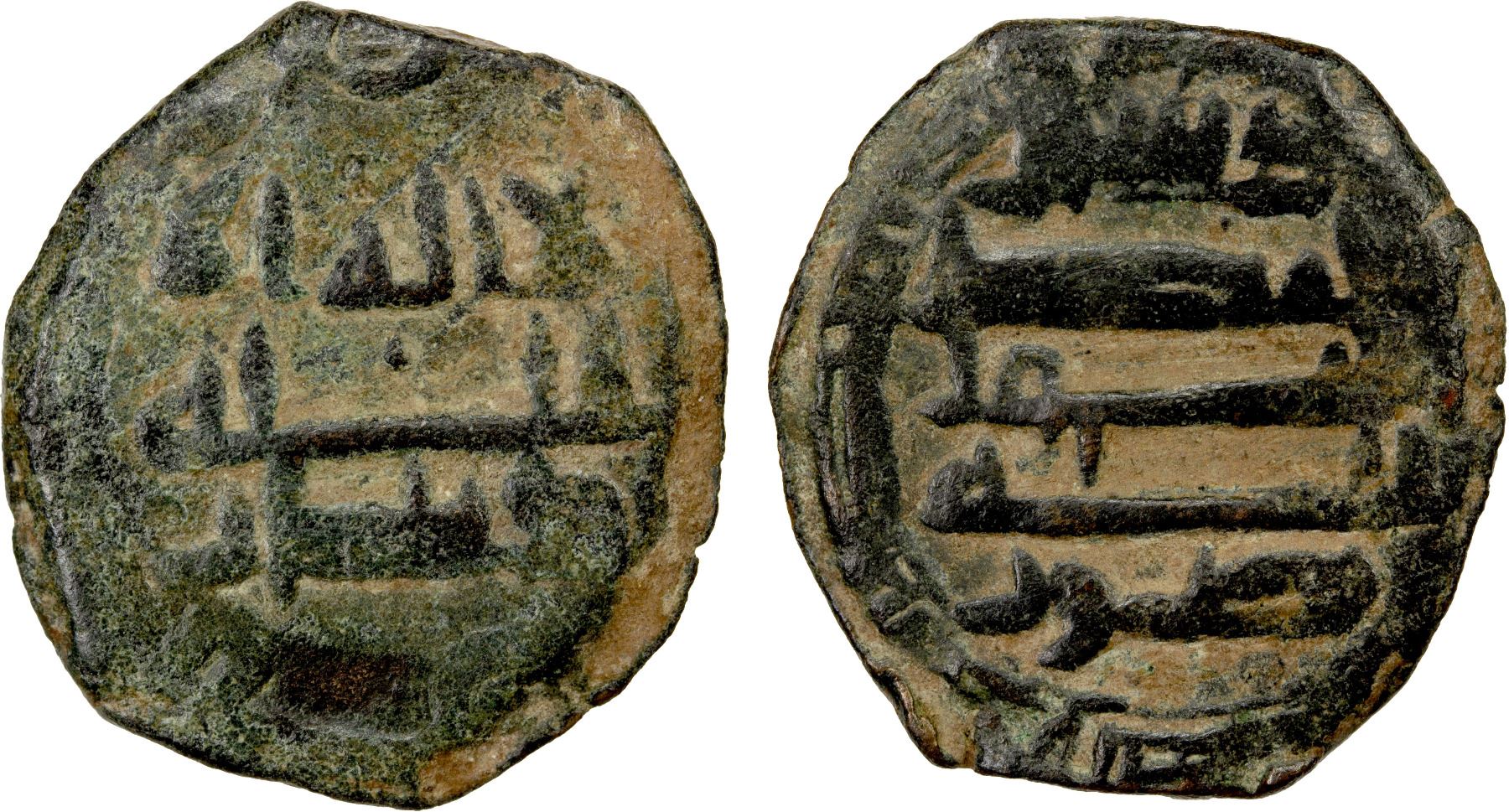 ABBASID: AE fals (3.12g), Sur, ND (ca. 850s-870s), A-293, citing Dinar below obverse & above reverse, mint name below reverse, cast as always, traces of a marginal legend on the reverse, pleasing VF, RR.