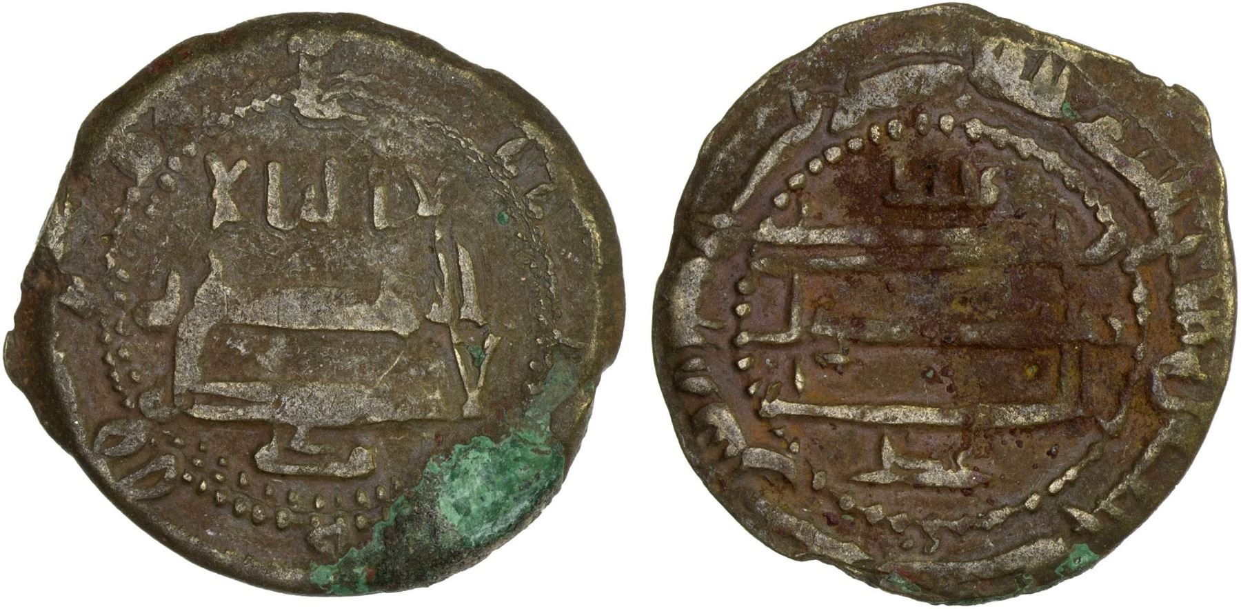 ABBASID: AE fals (3.91g), Makka, AH205, A-M300, cf. Zeno-258878, citing the mint Makka below the obverse field and the name Muhammad above and the word 'adl below the reverse field; some corrosion, Fine, RRR.