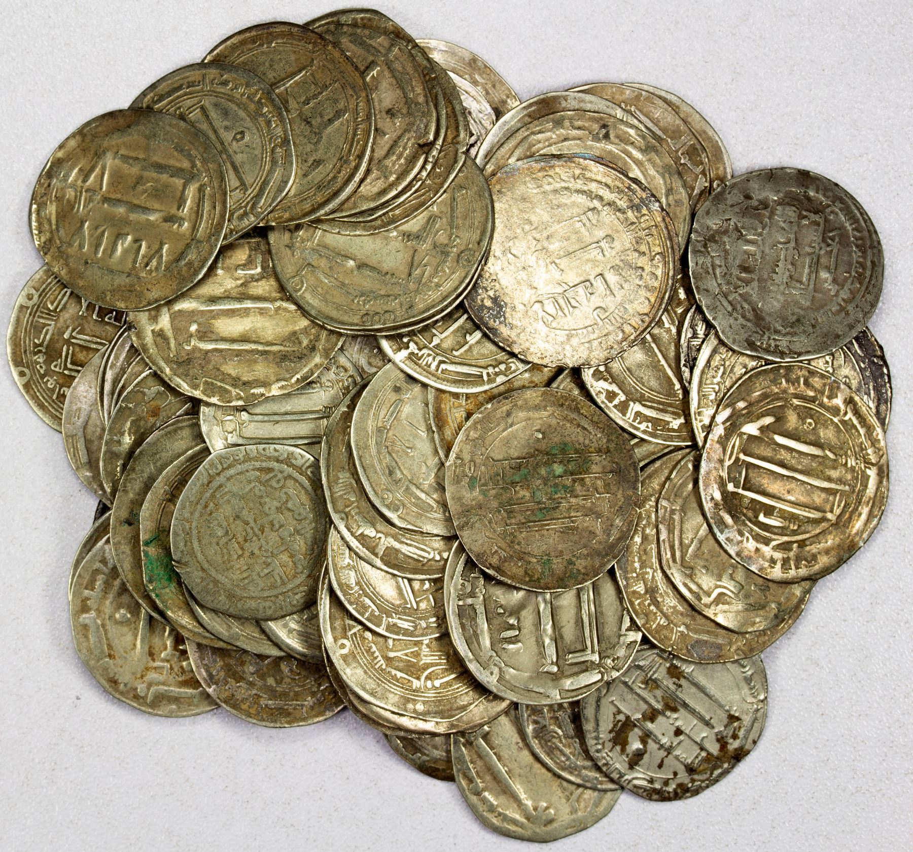 ABBASID: LOT of 77 silver dirhams, mostly from the period AH132-218, with a wide variety of rulers, date and mints, an interesting study lot, average quality examples, retail value $1850, lot of 77 coins. The Abbasid Caliphate was founded by a descendant of the Prophet Muhammad's uncle, Abbas ibn Abdul-Muttalib (566-653), from whom the dynasty takes its name. They ruled as caliphs for most of the caliphate from their capital in Baghdad (Madinat al-Salam) in modern-day Iraq, after having overthrown the Umayyad Caliphate in the Abbasid Revolution of 750-751.