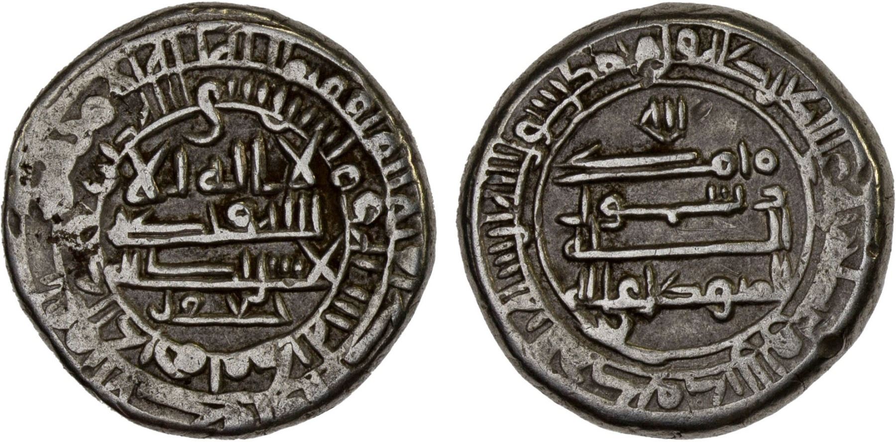 ABBASID OF YEMEN: al-Mutawakkil, 847-861, AR dirham (5.18g), AH"200", A-1053N, citing Ja'far below the obverse, with the mint/date formula bi-makiya sana wa mi'tayn, with the mint name either makka with an extra tooth or madina missing one tooth, now regarded as a contemporary imitation from eastern sources (modern Afghanistan or Pakistan), perhaps intended as a souvenir for the Hajj; probably finest known example of this interesting type, VF-XF, RRR. The name Ja'far appears below the obverse field, known on Yemeni gold dinars of al-Wathiq struck at San'a and dated AH232 and of al-Mutawakkil dated 234-235.