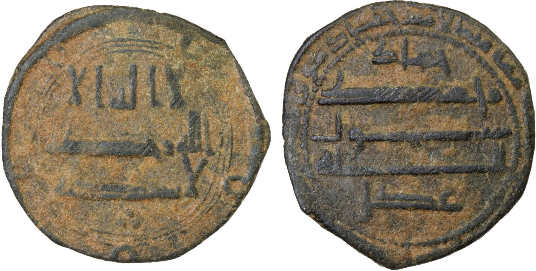 ABBASID OF YEMEN: temp. al-Rashid, 786-809, AE fals (2.19g) (San'a), ND/DM, A-1048F, standard fals design, no obverse marginal legend, governor Hammad cited as Mawlä in the reverse margin, and with the word 'adl instead of his patronymic barbar beneath the reverse field; unpublished and probably unique, VF, RRR.