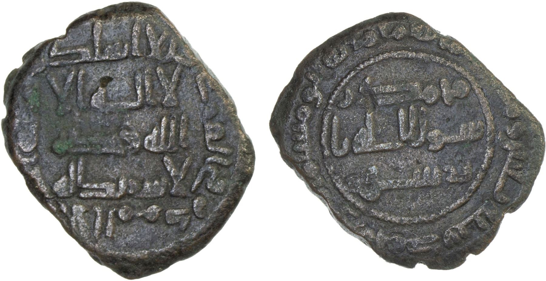 ABBASID REVOLUTION: 'Abd al-Rahman b. Muslim, AE fals (2.84g), Abarshahr, AH130, A-208A, first half of the kalima in center, Qur'an verse 42:23 in margin // last part of kalima followed by the mint name in center, both the name 'Abd al-Rahman b. Muslim and the date in the margin; the only known example of this type from the mint of Abarshahr, VF, RRR, ex CNG Islamic Auction 9, lot 55.