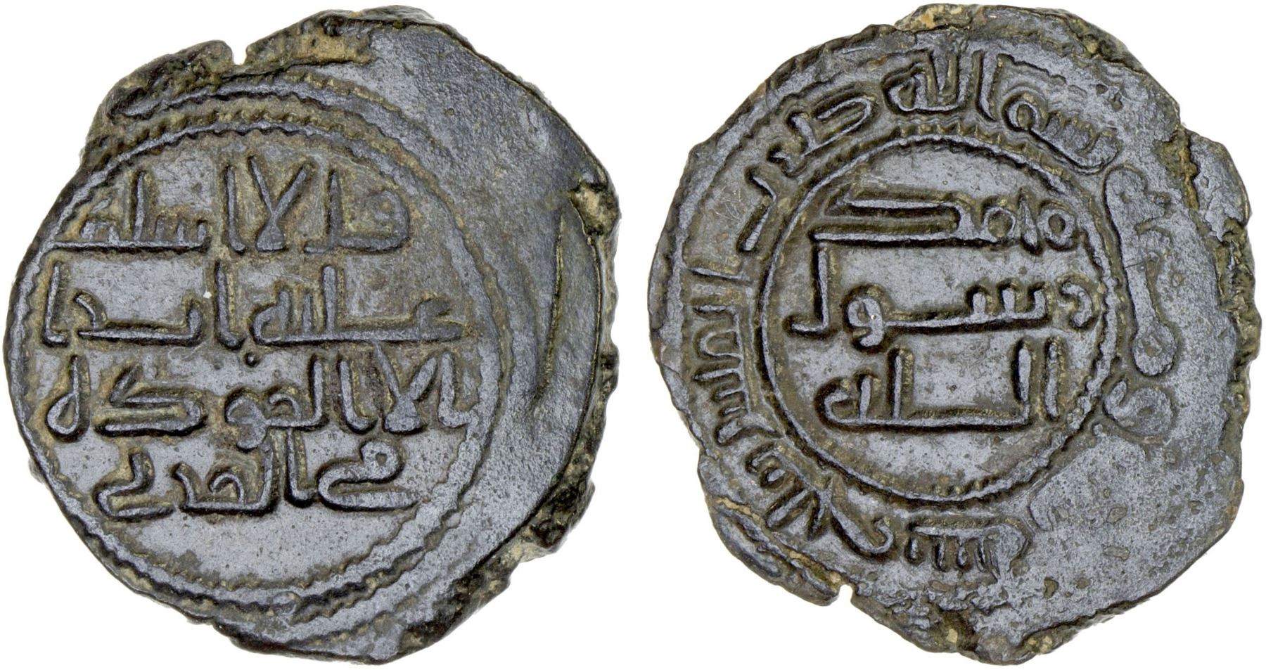 ABBASID REVOLUTION: Anonymous, AE fals (2.04g), Balkh, AH130, A-N209, Zeno-329121 (this piece), First part of Qur'an 42:23 filling the field // mint & date in the margin, muhammad rasul Allah in center, first example that shows both date and mint; probably the finest known example, XF, RRR.