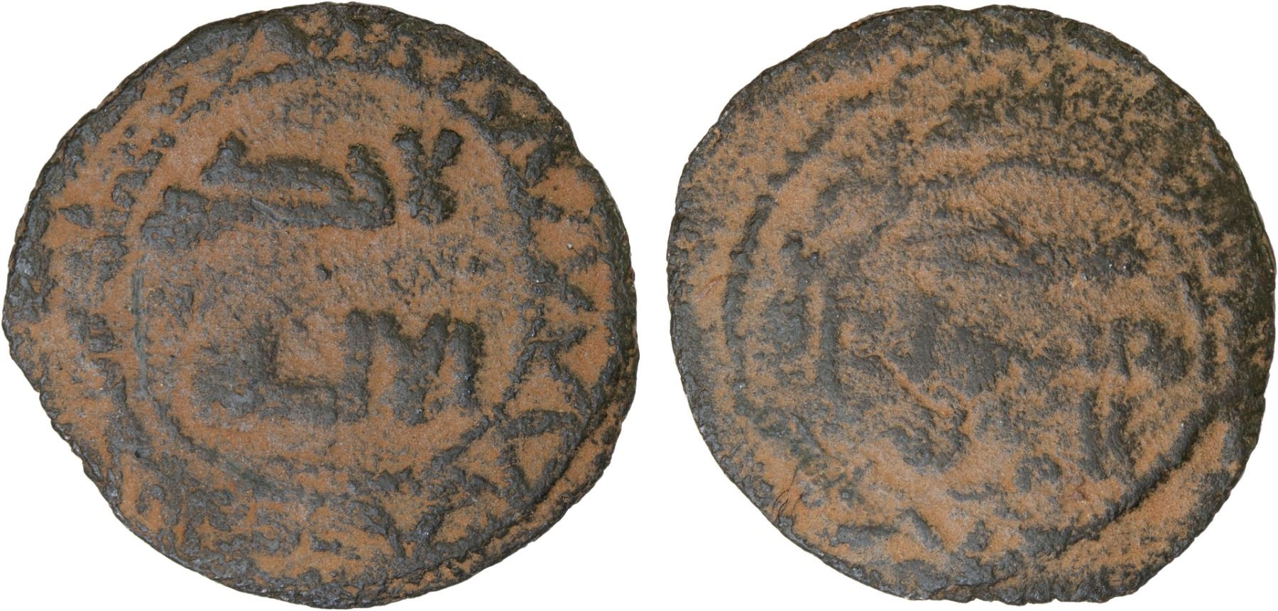 ABBASID REVOLUTION: Anonymous, ca. 120s, AE fals (1.66g), A-F208-var, cf. Zeno-283798, with the Kharijite phrase la hukma illa lillah in the obverse field // 2nd half of the kalima in the center, traces of date formula and possibly also a mint name in the margin, the date tentatively read as AH(1)2x, crude F-VF, RRR. This appears to be the second known example, after the piece field on Zeno.