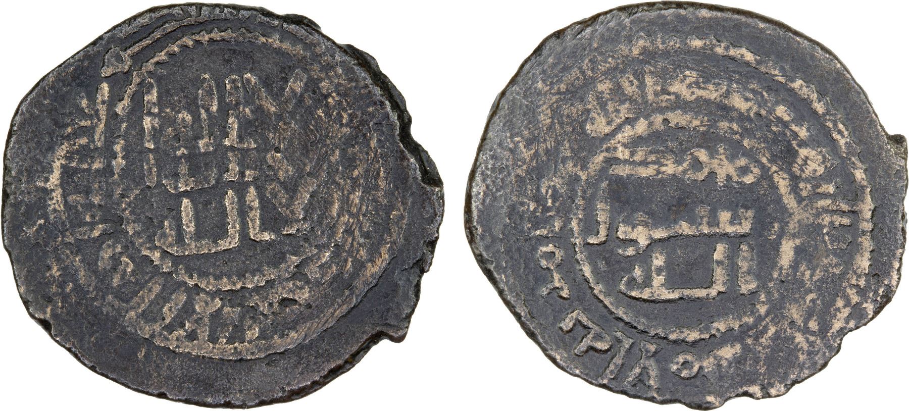 ABBASID REVOLUTION: Khalid b. Ibrahim, ca. 755-757, AE fals (1.50g), NM, ND, A-E209, struck by Khalid as governor of Khorasan, but is classified conveniently as revolutionary because of the presence of the Qur'an verse 42:23; always without mint name and either undated or dated AH138-139, Fine, RRR.