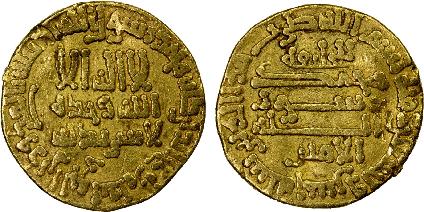 ABBASID: al-Amin, 809-813, AV dinar (4.20g), NM (Egypt), AH195, A-220.2, li'l-khalifa / al-amin on the reverse; one small dent, Fine to VF.