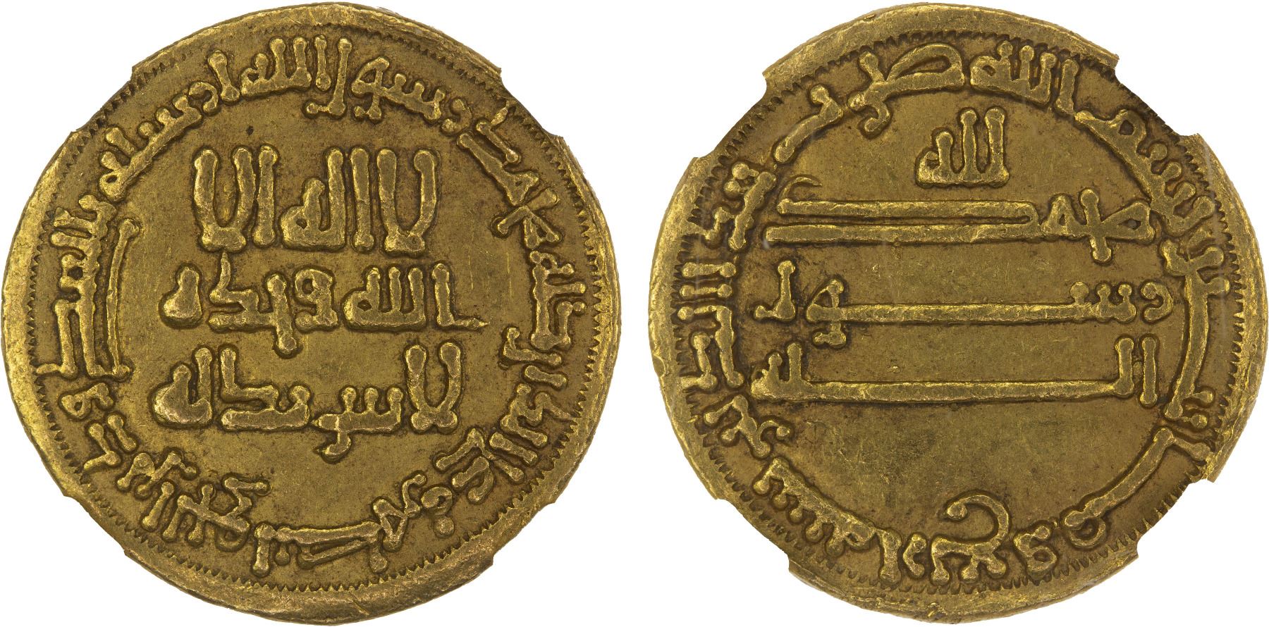 ABBASID: al-Ma'mun, 810-833, AV dinar (4.25g), NM (Iraq), AH204, A-222.14, without any personal names, lillah above the reverse field, NGC graded AU53.