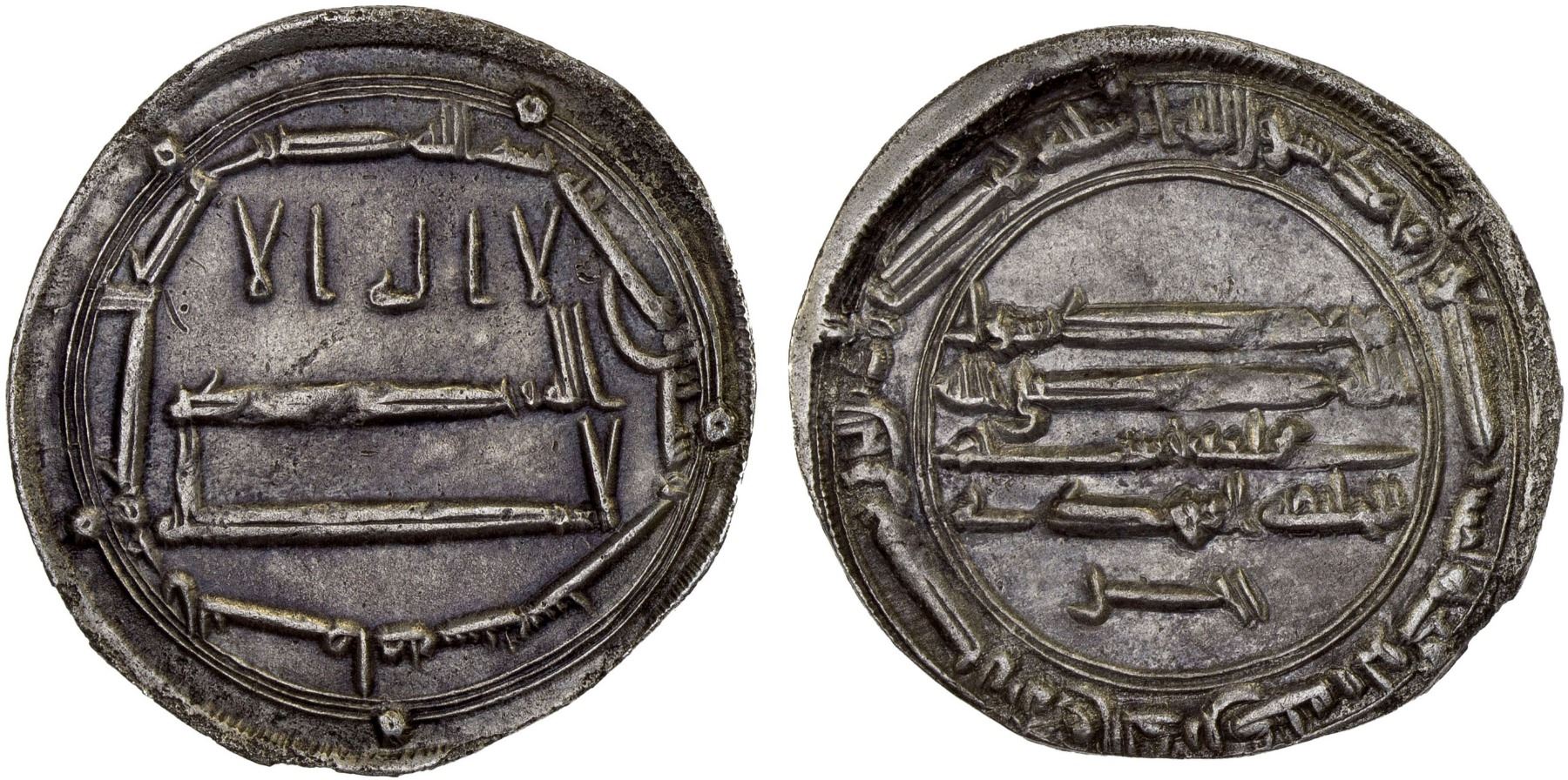 ABBASID: al-Mahdi, 775-785, AR dirham (2.64g), al-Yamama, AH166, A-215.1, inscribed hajar below the reverse field, bold strike, nearly XF, R. Al-Yamama was the first mint in Arabia to strike silver coins, located near the modern city of Riyadh, with its administrative capital at the town of Hajar. It operated AH165-170.