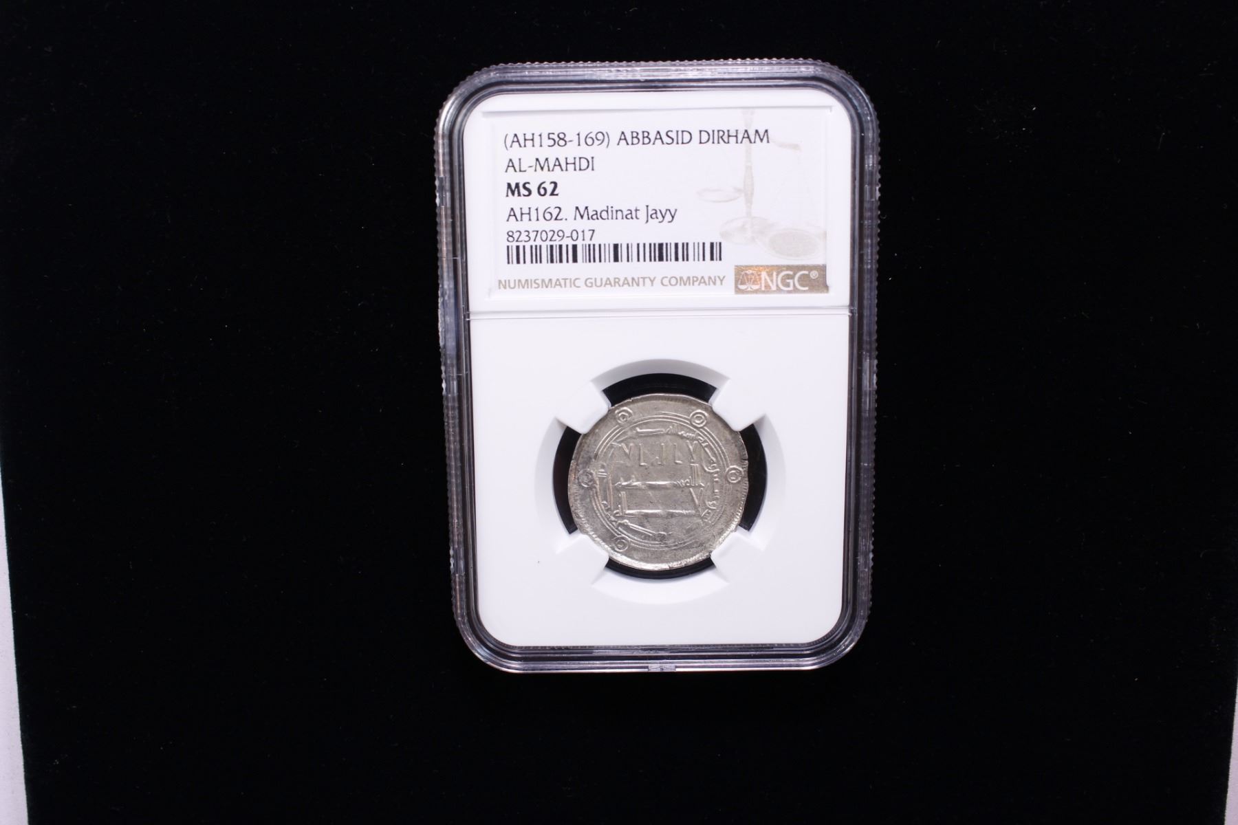 ABBASID: al-Mahdi, 775-785, AR dirham, Madinat Jayy, AH162, A-215.1, citing Yahya on reverse, lightly lustrous, NGC graded MS62.