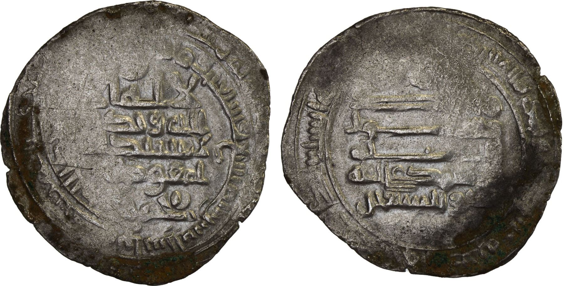 ABBASID: al-Mu'tamid, 870-892, AR dirham (2.91g), Ra's al-'Ayn, AH277, A-240.2, citing the heir of the west al-Mufawwad on the obverse, with the name muhammad below, and the unusual title dhu'l-sayfayn ("possessor of the two swords") below the reverse; about 12% flat strike and some double-striking on the obverse; unpublished and probably unique, VF, RRR. We found that the title "dhu'l-sayfayn" appears only on dirhams struck at al-Mawsil, unusual dated AH276, and this is the first from Ra's al-'Ayn, located about 150 miles west of al-Mawsil.