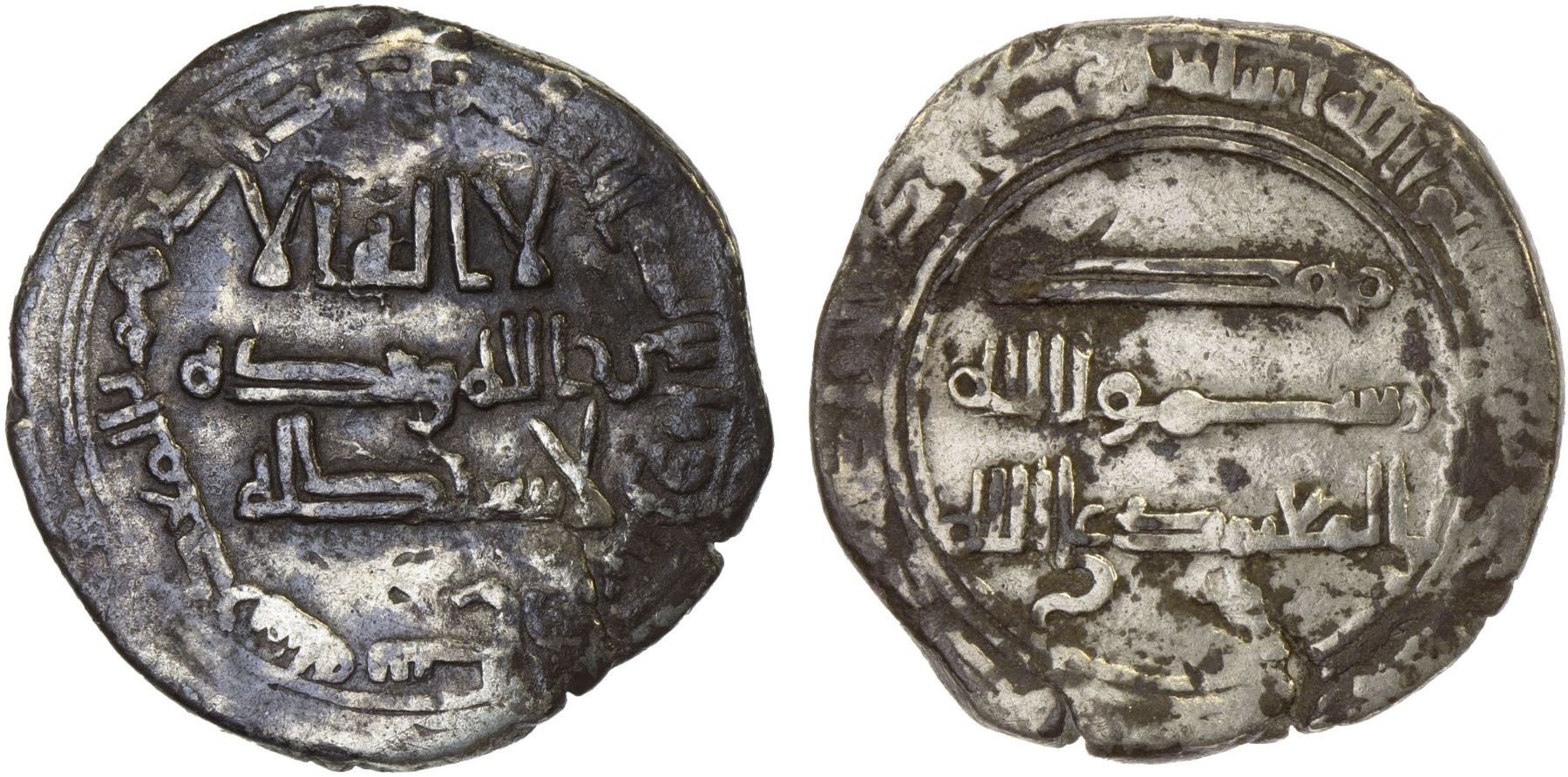 ABBASID: al-Mu'tamid, 870-892, AR dirham (3.00g), al-Ma'din, AH267, A-240.10, citing only the caliph al-Mu'tamid, with a few spots of weakness but the mint & date fully legible; only the 2nd known example of this mint for al-Mu'tamid (the other dated AH273), F-VF, RRR. The mint name means "the mine" or "the market", in this case located somewhere around Andaraba or Banjhir. The same entered Spanish, spelled Almaden, which became the name of a mining town near San Jose, California.