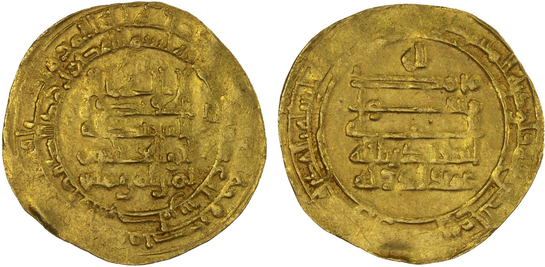 ABBASID: al-Muqtadir, 908-932, AV dinar (3.89g), Filastin, AH320, A-248, Bernardi-243Gn, citing the vizier 'Imad al-Dawla, some small flat spots only in the margins, VF-XF. 'Imad al-Dawla was cited on silver & coin coinage only for several months in AH320.
