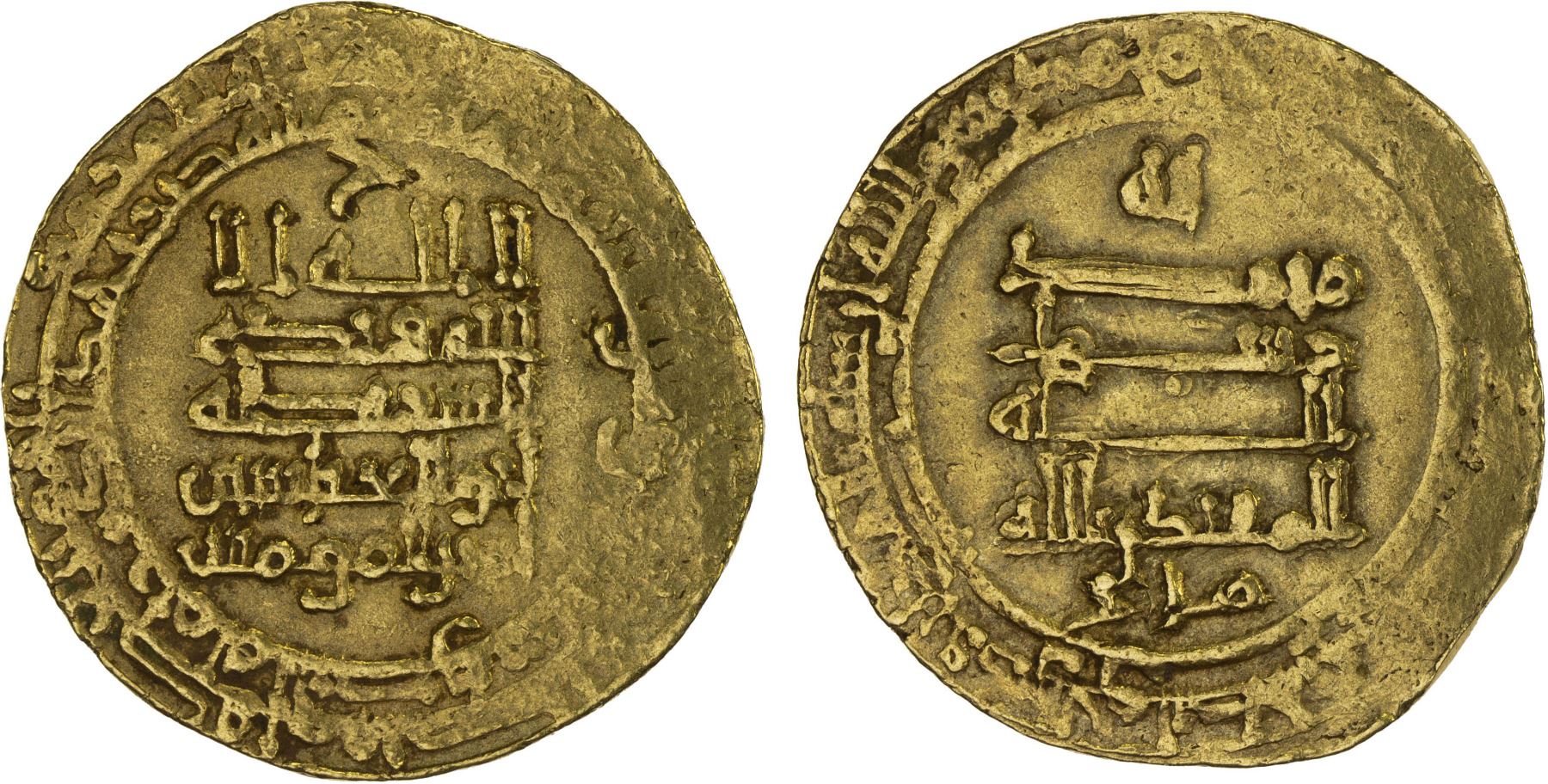 ABBASID: al-Muqtadir, 908-932, AV dinar (5.46g), Mah al-Basra, AH31(8), A-245.2, Bernardi-242Mg, with the letter hard "h" above the obverse field, and the initials of the Ziyarid ruler Mardawij below the reverse, strong VF.