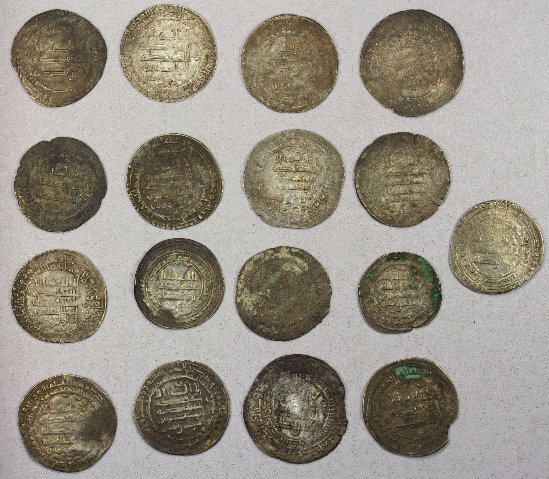ABBASID: al-Muqtadir, 908-932, LOT of 17 silver dirhams, including mints of Madnat al-Salam, Surra man Ra’a, Harran, Antakiya (DM), Ra's al-'Ayn, al-Muhammadiya, Suq al-Ahwaz, Shiraz, and Tustar min al-Ahwaz (many with legible date), and one with mint illegible; also one each of al-Mu'tadid, al-Muktafi, and the Samanid Ahmad b. Isma'il; average nearly VF condition, but most with some weakness; retail value $500, lot of 17 pieces.