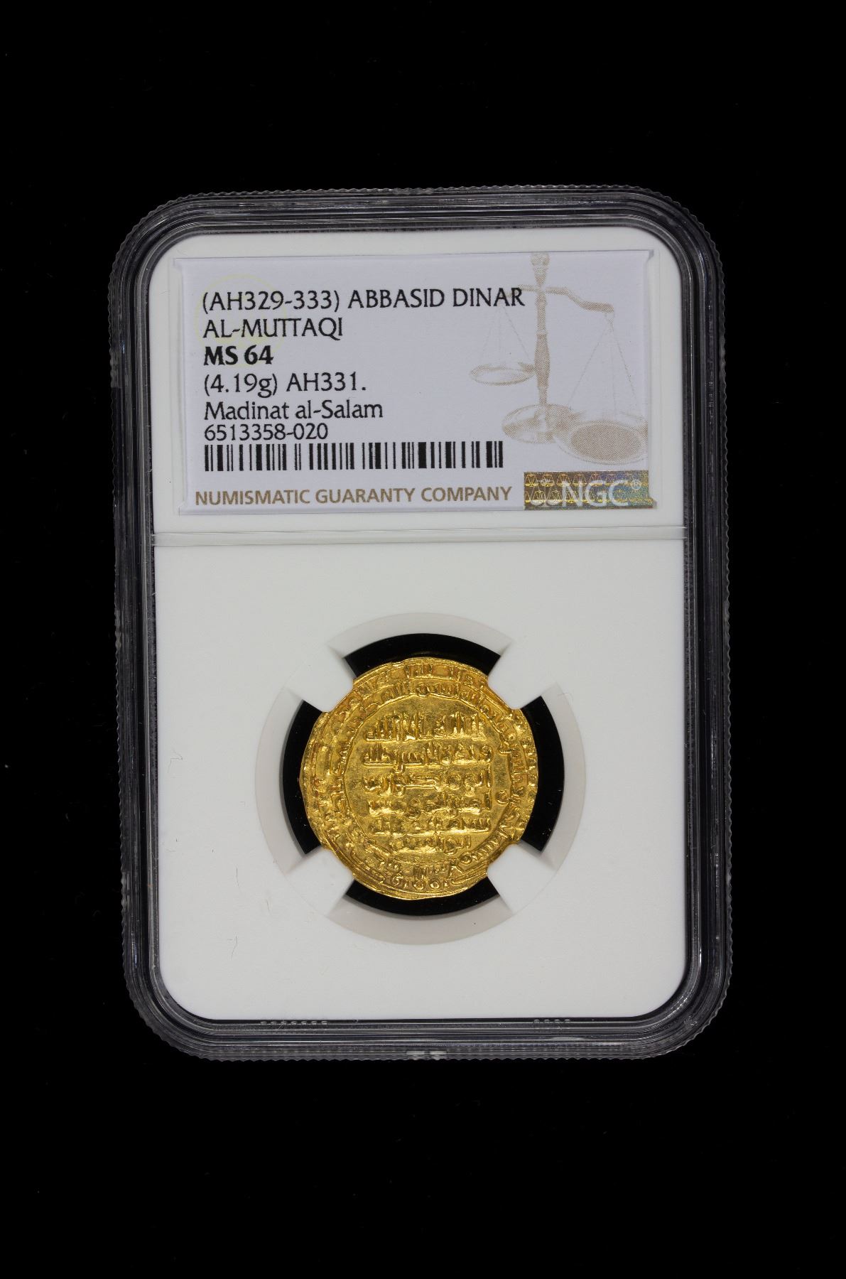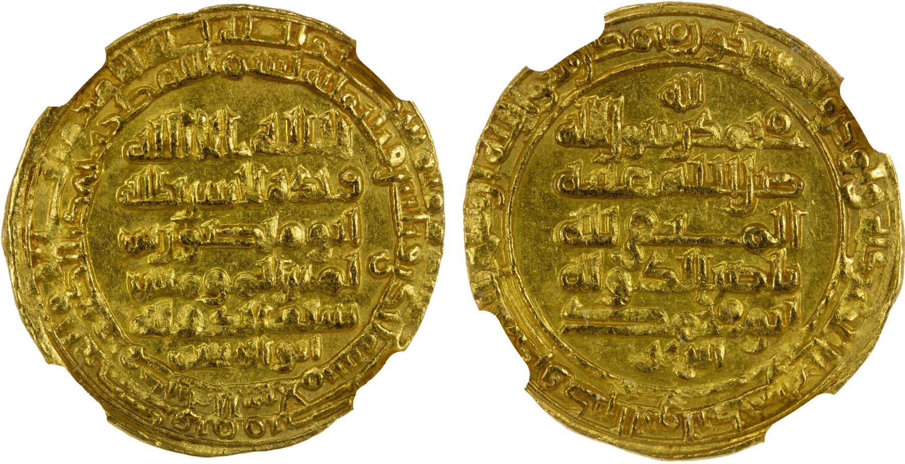 ABBASID: al-Muttaqi, 940-944, AV dinar (4.19g), Madinat al-Salam, AH331, A-260, citing the joint chief amirs Sayf al-Dawla and Nasir al-Dawla, NGC graded MS64.