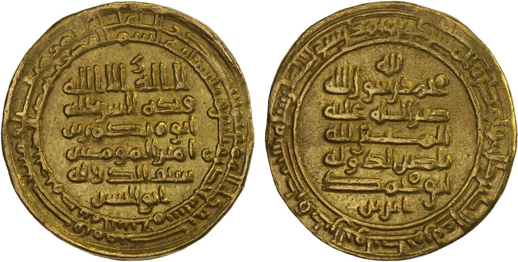 ABBASID: al-Muttaqi, 940-944, AV dinar (4.45g), Madinat al-Salam, AH331, A-260, citing the Hamdanid amirs Nasir al-Dawla Abu Muhammad and Sayf al-Dawla Abu'l-Hasan, with the word "ibriz" below the reverse field, an Arabic word derived from the Byzantine word meaning "pure gold"; beautiful strike, choice VF-XF.