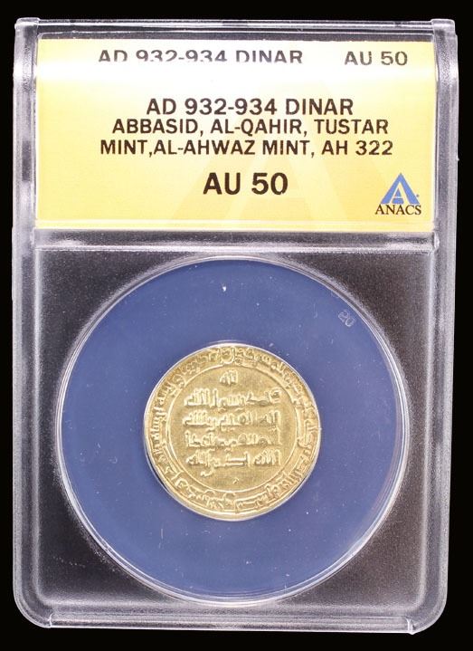 ABBASID: al-Qahir, 932-934, AV dinar, Tustar min al-Ahwaz, AH322, A-252, with additional royal title that means "the avenger of God's enemies for the sake of God's religion", ANACS graded AU50.