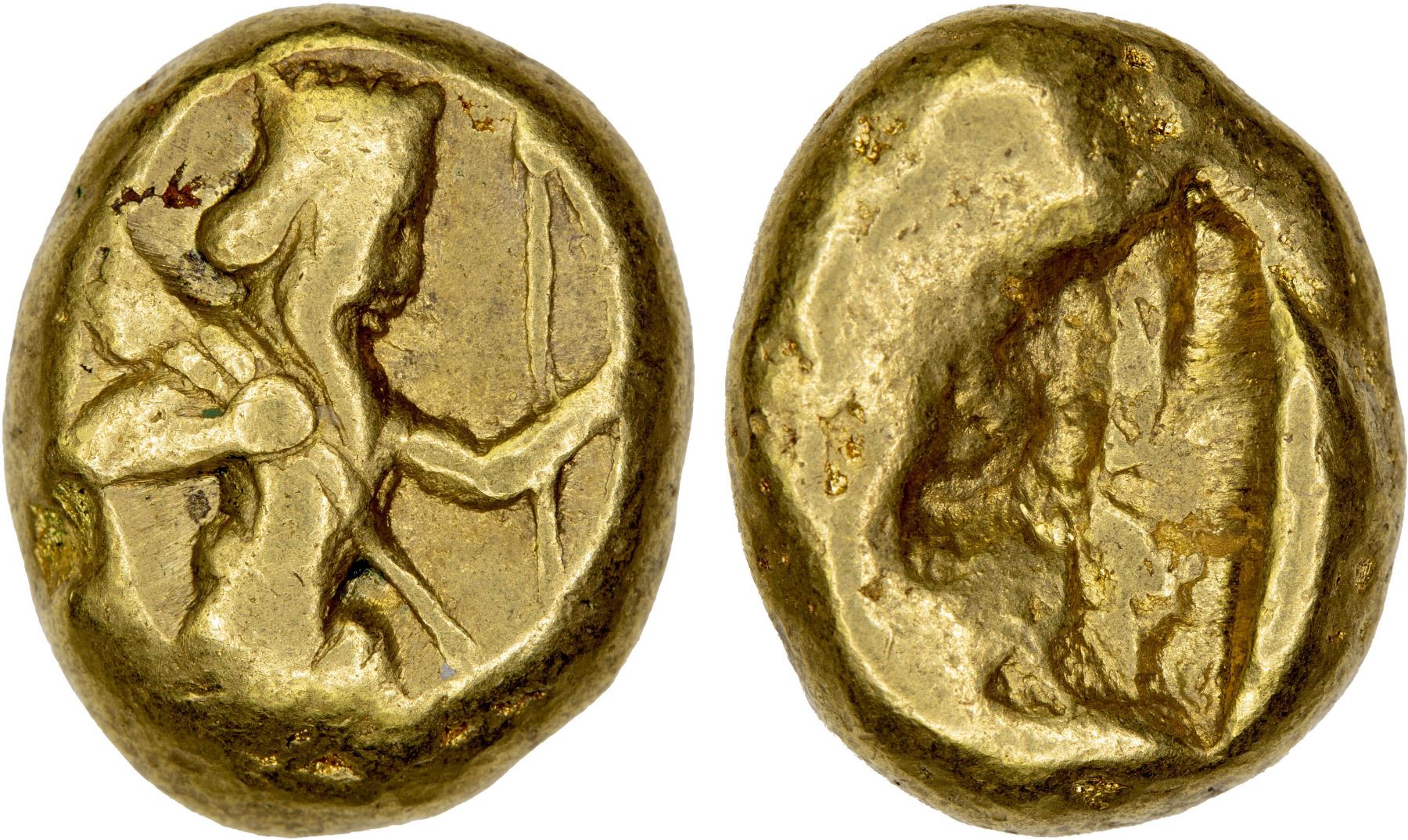ACHAIMENIDIAN EMPIRE: temp. Xerxes II to Artaxerxes II, ca. 420-375 BC, AV daric (8.35g), Sardes, Carradice Type-IIIb (late type), BMC Arabia pl. XXIV-26; Sunrise-24, Persian king or hero, wearing kidaris and kandys, quiver over shoulder, in kneeling-running stance right, holding spear and bow // incuse punch, F-VF
