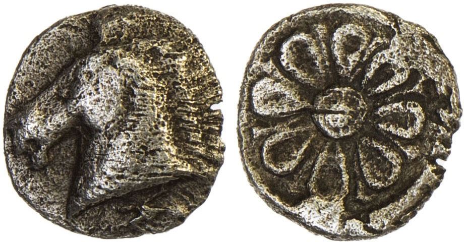 AEOLIA: Kyme, AR tetartemorion (0.15g), 5th century BC, head of horse left // rosette, unpublished and very rare, VF, ex James Lamb Collection. See CNG e-Auction 515, Lot 178 for a similar example.