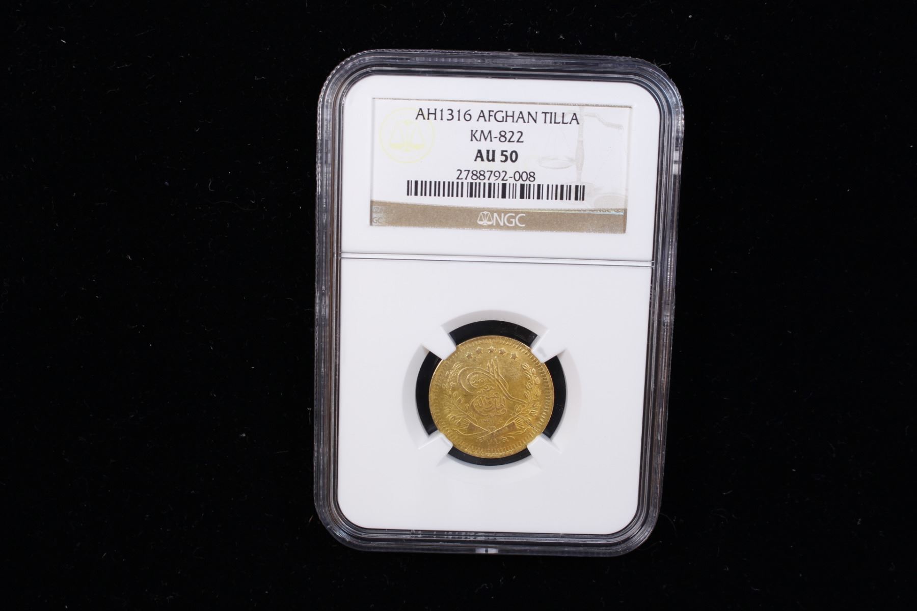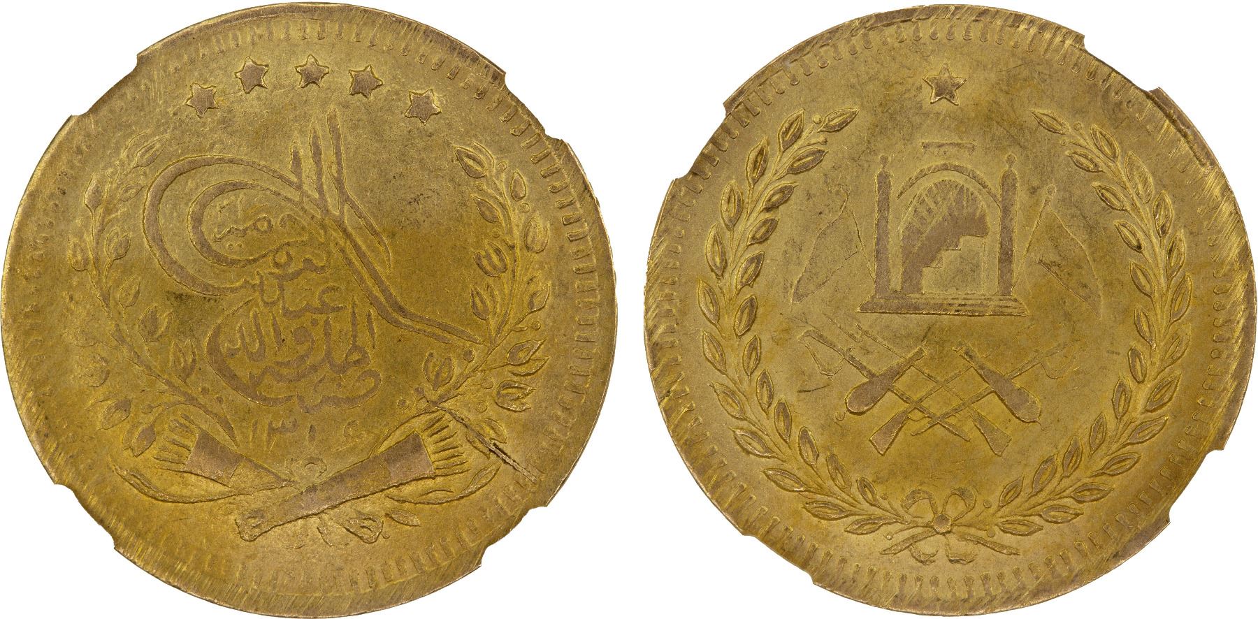 AFGHANISTAN: Abdur Rahman, 1880-1901, AV tilla, NM (struck at Kabul), AH1316, KM-822, toughra within wreath, with his title diya' al-milla wa'l-din // mosque above crossed swords, NGC graded AU50, R.