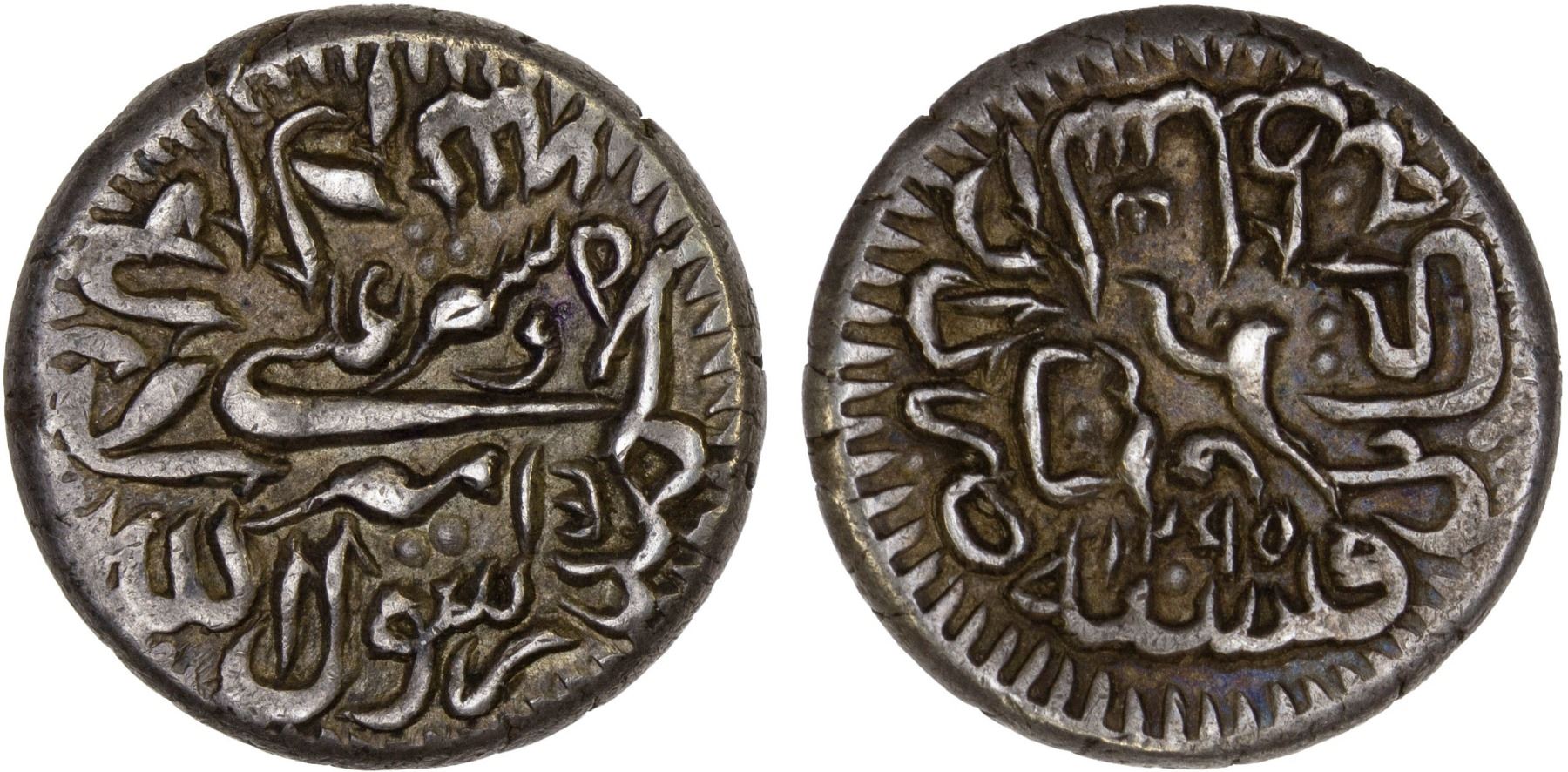 BARAKZAI: Sher 'Ali, 1863-1879, AR 1/2 rupee (4.56g), Kabul, AH1295, A-3168.2, KM-514, thick calligraphy milled type, with Persian denomination nim rupiyeh, some iridescent toning, Choice VF, ex Anton Holt Collection.
