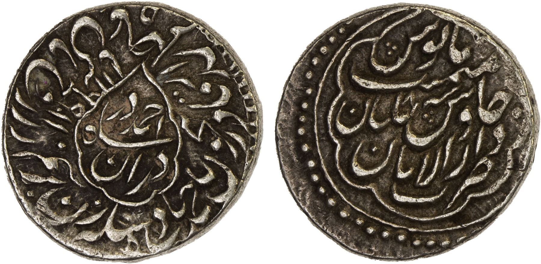 DURRANI: Ahmad Shah, 1747-1772, AR rupee (11.55g), Multan, AH1169 year 8, A-3092, ahmad shah durrani within central mihrab, hijri date to left // mintname and epithet, with regnal year, one light shroff mark on edge, VF-XF.