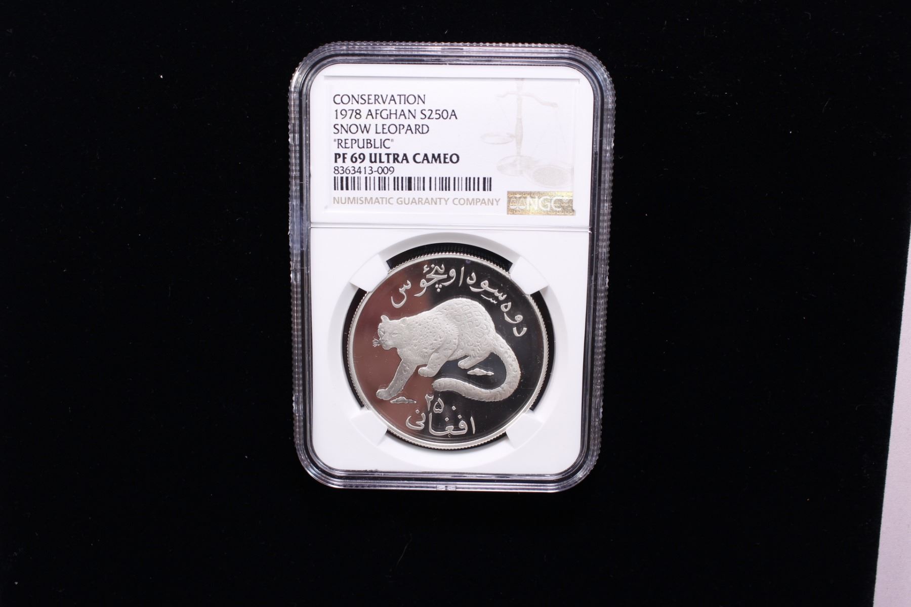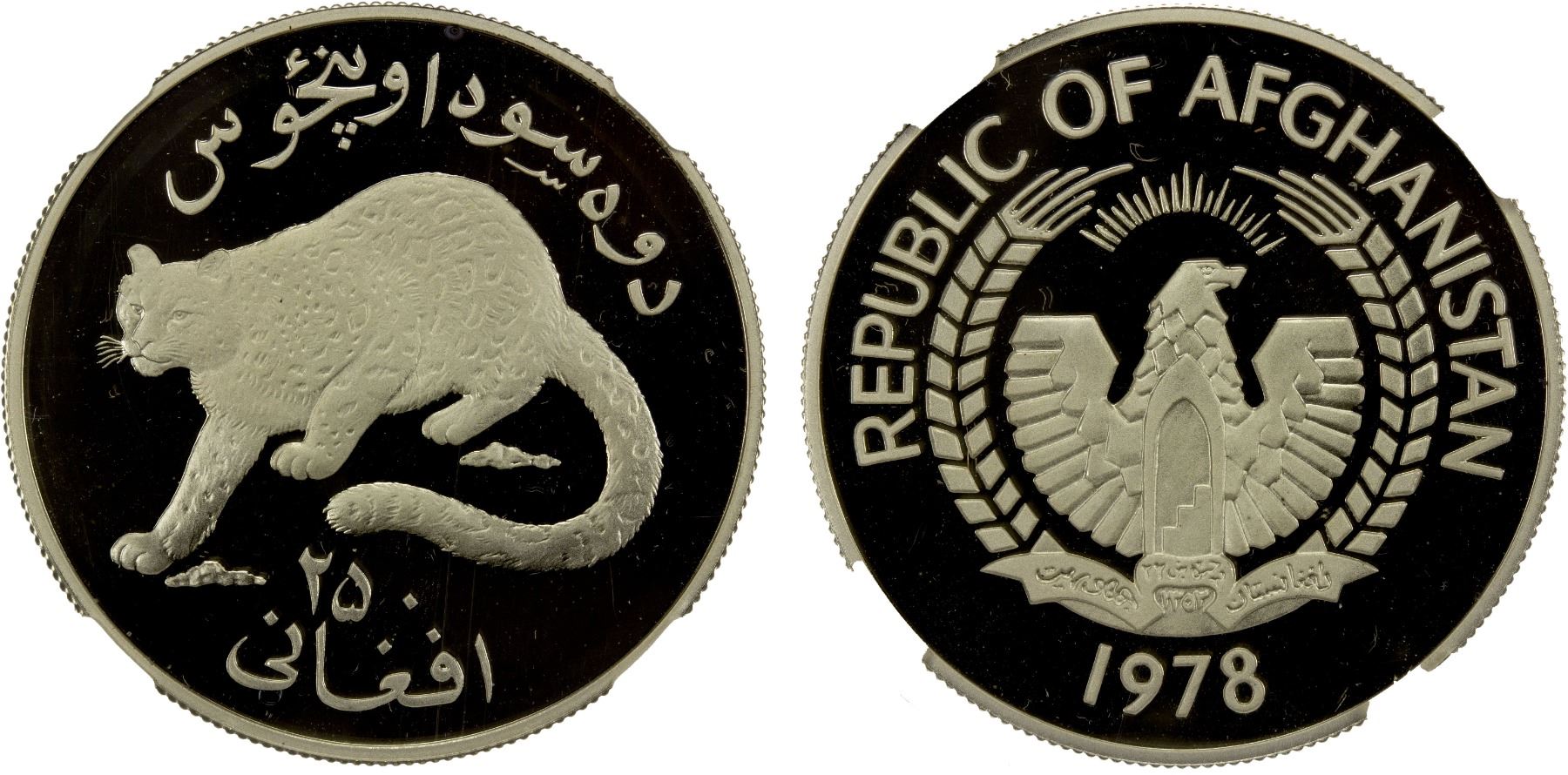 AFGHANISTAN: Democratic Republic, AR 250 afghanis, 1978, KM-979, World Wildlife Fund - Snow Leopard, struck at the British Royal Mint, NGC graded PF69 Ultra Cameo.