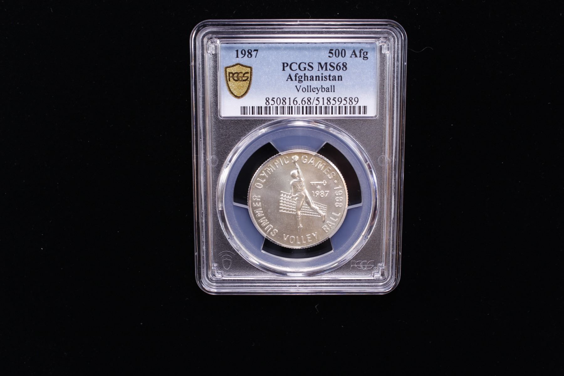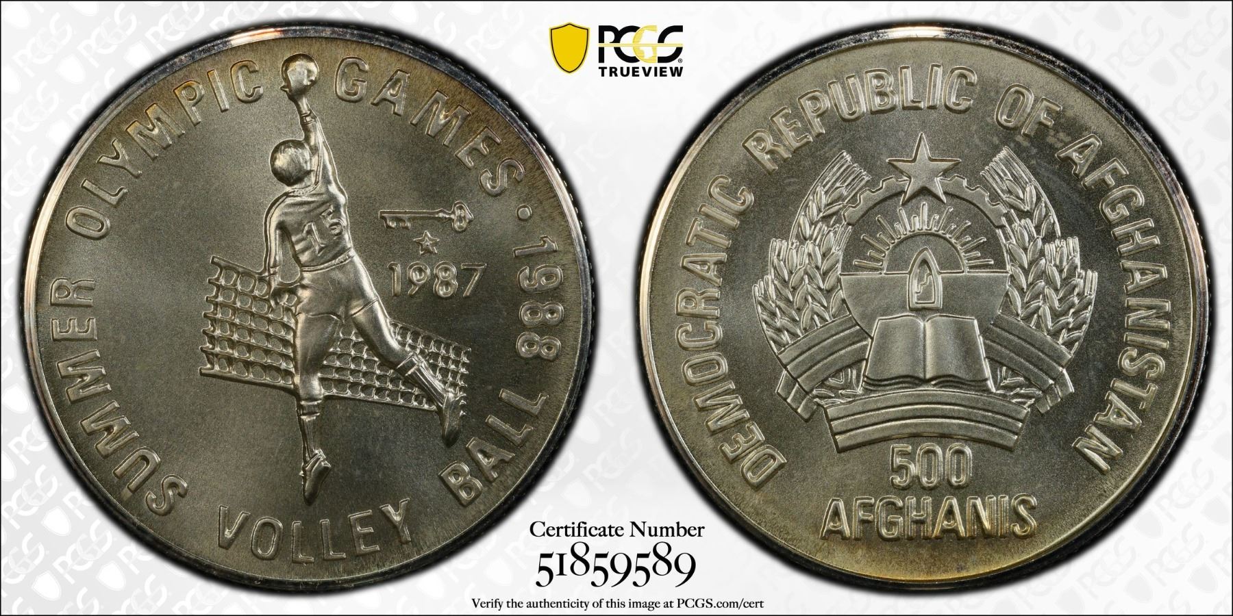 AFGHANISTAN: Democratic Republic, AR 500 afghanis, 1987, KM-1010, Schön-117, 1988 Summer Olympics, Seoul - Volleyball, struck at the Havana Mint, a spectacular example, PCGS graded MS68.