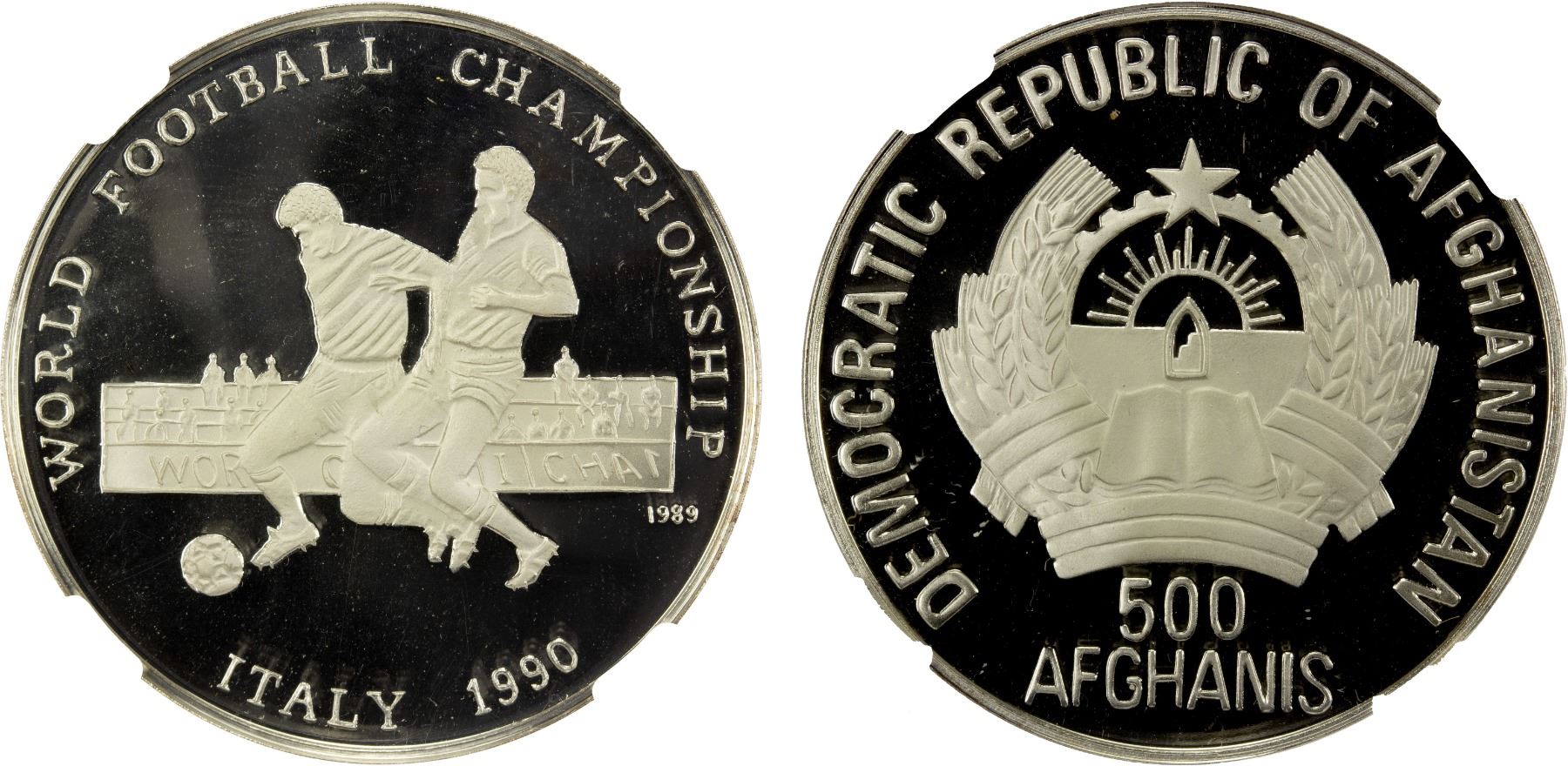 AFGHANISTAN: Democratic Republic, AR 500 afghanis, 1989, KM-1011, FIFA World Cup, NGC graded PF69 Ultra Cameo.