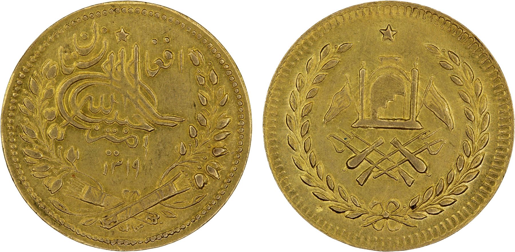 AFGHANISTAN: Habibullah, 1901-1919, AV tilla (4.62g), NM (struck at Kabul), AH1319, KM-836.1, toughra in wreath, date below, country name above // mosque and crossed arms within wreath, AU, R, ex Hakim Hamidi Collection.