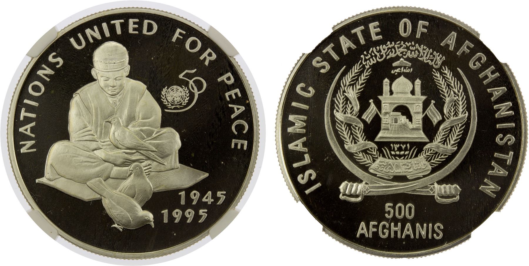 AFGHANISTAN: Islamic State, AR 500 afghanis, 1995, KM-1031, 50th Anniversary United Nations, NGC graded PF69 Ultra Cameo.