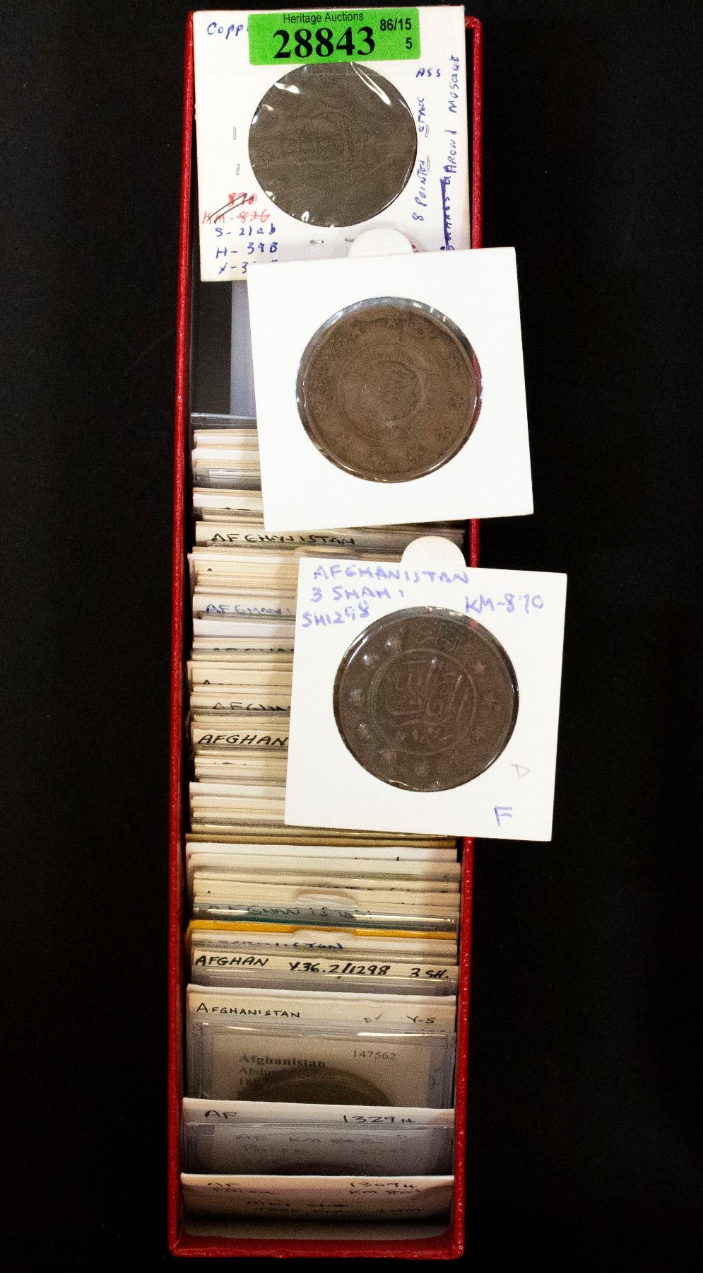 AFGHANISTAN: LOT of 58 coins (9 silver, the rest base metals), including the following by KM-numbers: KM-801, 802, 803 (Good), 827, 849 (2 pcs), 863, 869, 870 (2), 871, 880 (2), 881 (3), 883 (3), 907, 909 (AR afghani), 918, 919, 920 (AR ½ afghani, 2 pcs), A922, 923, 924, 926 (AR ½ afghani, 3 pcs), 929, 930, 931, 932 (AR ½ afghani, 3 pcs), 936 (2), 937, 938, 939, 940, 941 (2), 942, 944, 945, 946, 947, 949, 950, 953 (2), 954, 955 (2), and one AH1315 ¼ anna of Muscat & Oman; average circulated grades, many of the latest issues uncirculated or at least choice EF; retail value $650, lot of 58 pieces.