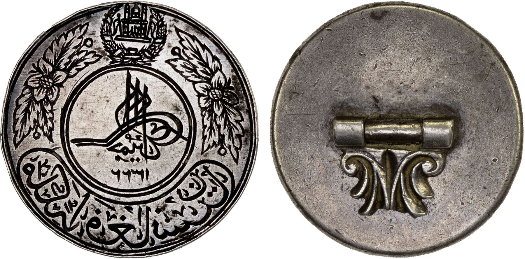 AFGHANISTAN: Muhammad Zahir Shah, 1933-1973, silver seal (12.95g), SH1322 (1943/4), 32mm, toughra of Humaira Begum in center circle, solar hijri date below, national emblem in margin above, with floral decorations to either side, Persian inscription malika-i afghanistan ("queen of Afghanistan") in cartouche below, reverse attached with hinged handle, a well-made example of fine workmanship, very possibly made for official use, Choice XF.
