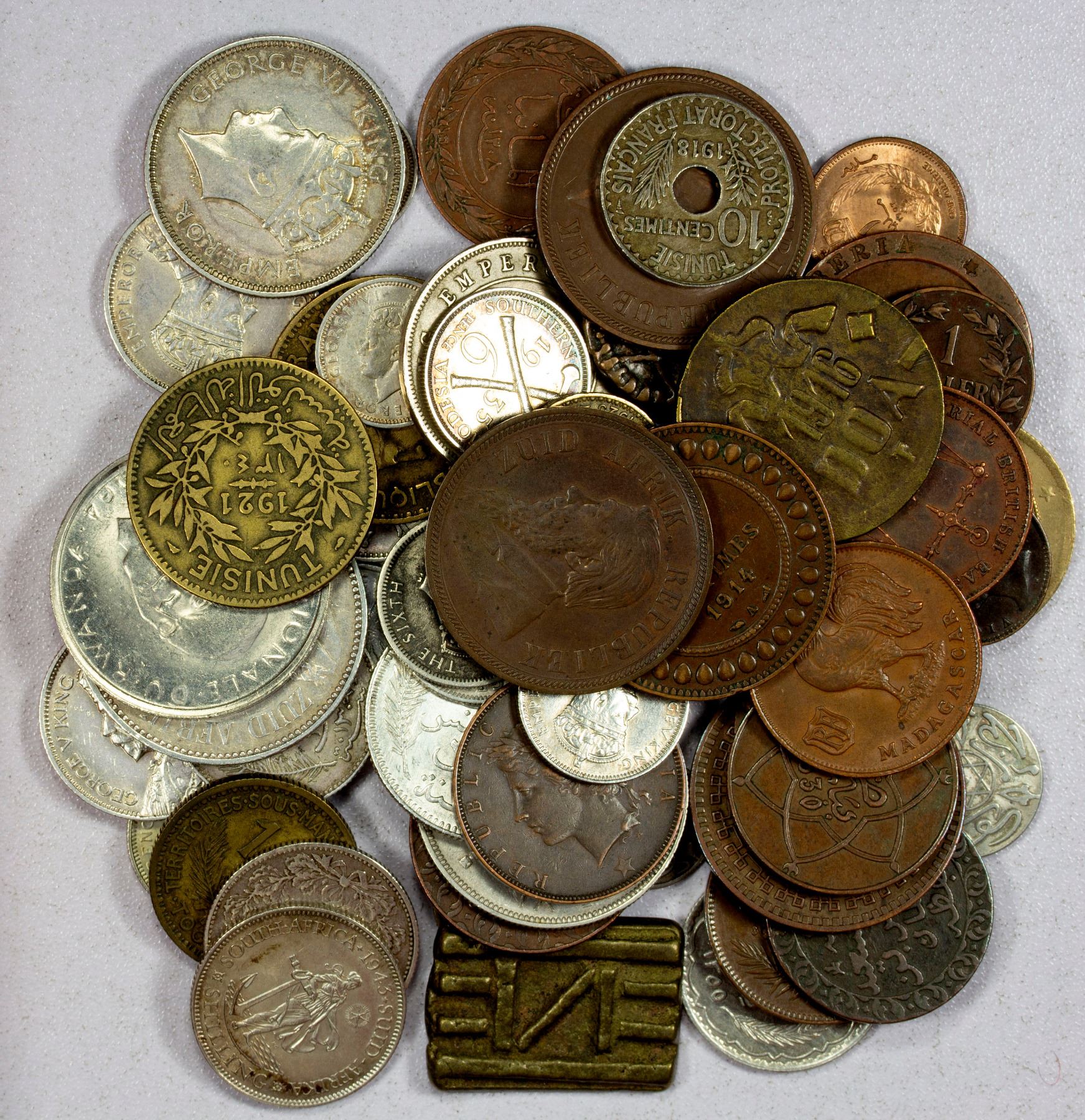 AFRICA: LOT of 64 coins, from a variety of colonies and nations, mostly from the late-18th century to the 1960's, including German East Africa (4), Katanga (1), Liberia (3, incl. two 19th century coppers), Libya, Madagscar, Mauritius (4, incl. an AR 1/2 rupee 1934), Mombasa, Morocco (8), Rwanda, Ruanda-Urundi (2), Seychelles (AR rupee 1939), South Africa (8, incl. an 1896 AR 2½ shillings), Southern Rhodesia (7, incl. a 1937 AR 2 shillings), Togo (a set of 3 from the 1920's), Tunisia (12, six of them silver), Zanzibar (2), plus an Akan brass gold weight; various conditions, many nicer than average for type; retail value $500, lot of 64 pieces, ex Dr. Robert A. Rosenfeld Collection.