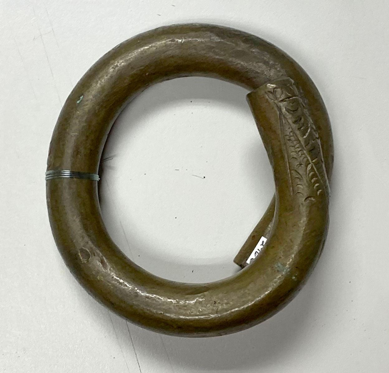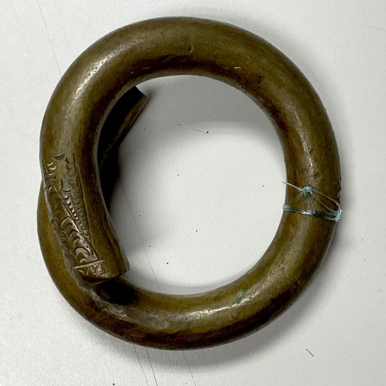 AFRICA: brass ring money (505g), cf. Opitz p.276, ca. 9.5 x 8.5cm, plain ring with decorated ends, used as money in many parts of West Africa, EF, ex Charles Opitz Collection.