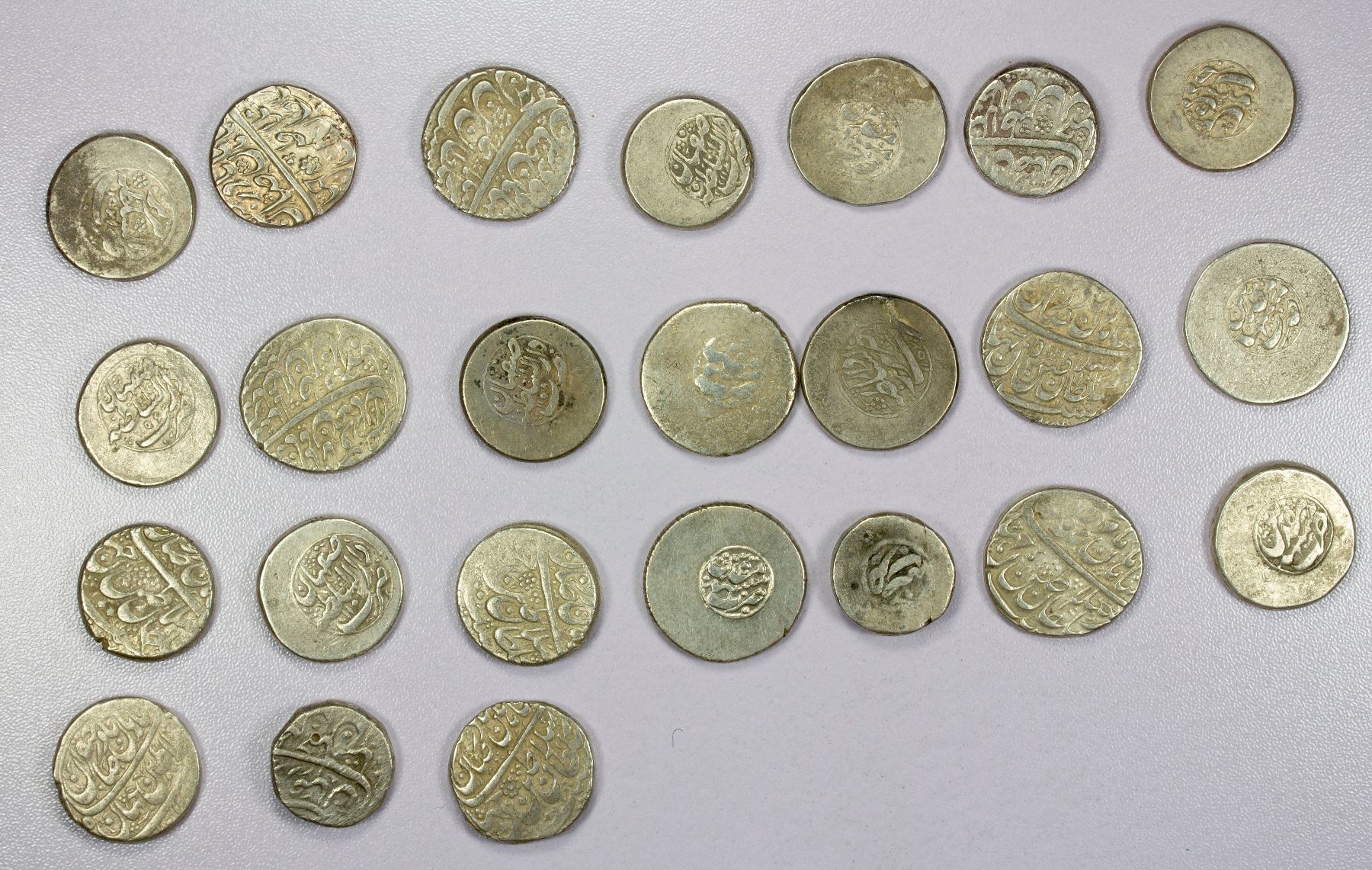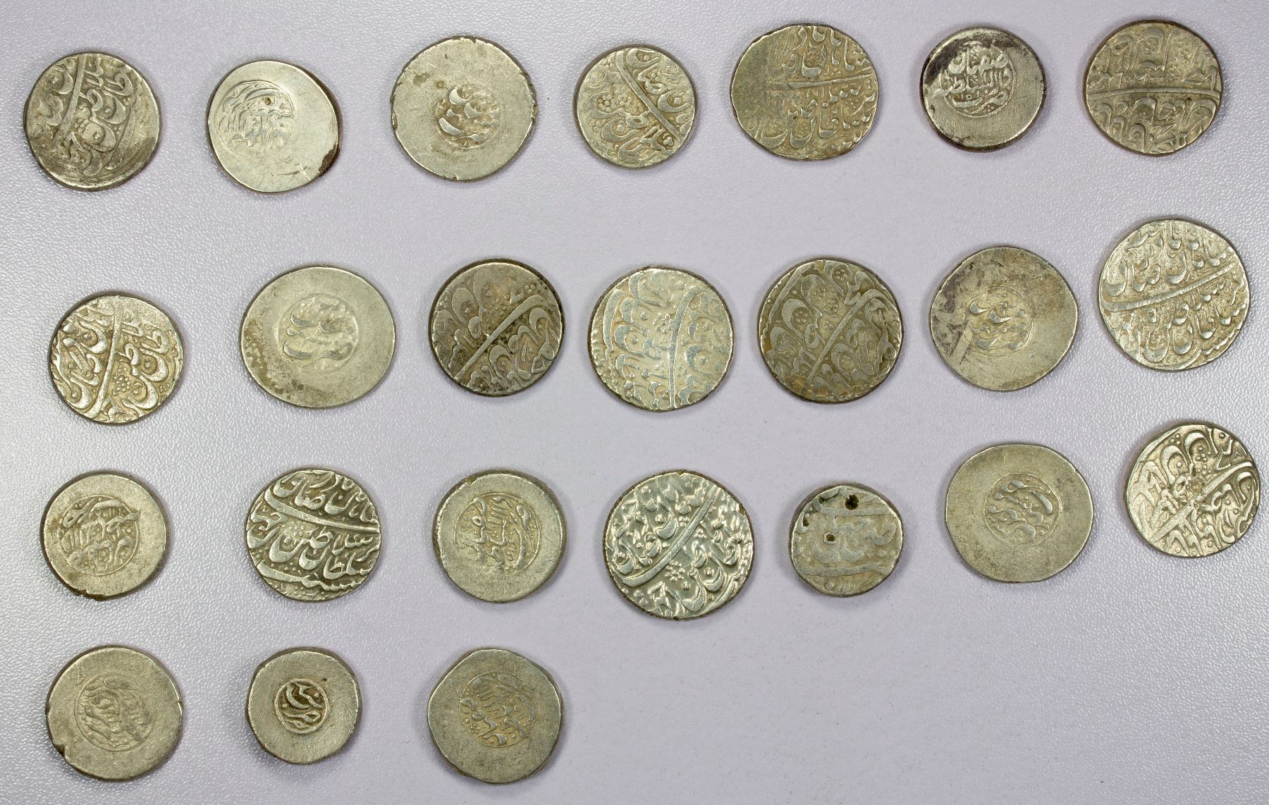 AFSHARID: Nadir Shah, 1735-1747, LOT of 24 silver rupis, type A-2744.1, including mints of Isfahan (9 pcs, most with legible date, average F-VF condition), Mashhad (10, all with date off flan, mostly VF), Sind (2, both undated, VG with much porosity), and Tabriz (3, all with legible date, average F-VF); retail value $650, lot of 24 pieces.