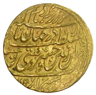 AFSHARID: Nadir Shah, as king, 1735-1747, AV ashrafi (3.44g), Shiraz, AH1149, A-2741, type B, also with the abjad equivalent of 1148, and the date 1148 in numerals below the reverse, choice EF, R, ex. Richard Accola collection.