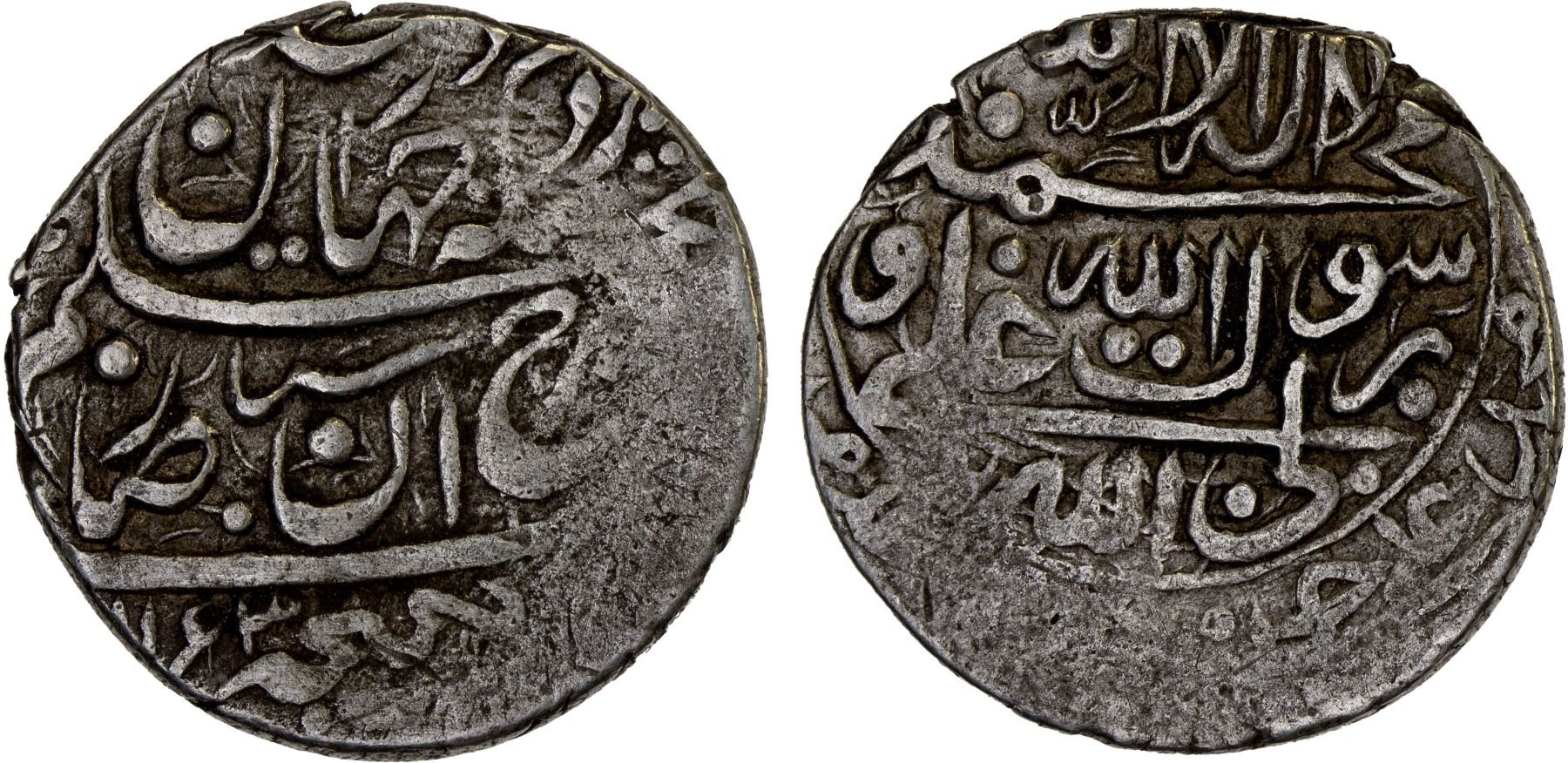 AFSHARID: Shahrukh, 1748-1750, AR abbasi (4.59g), Ganja, AH1163, A-2776, actually an issue of the khanate of Ganja, but in the name of Shahrukh, about 10% flat strike, VF, RR.