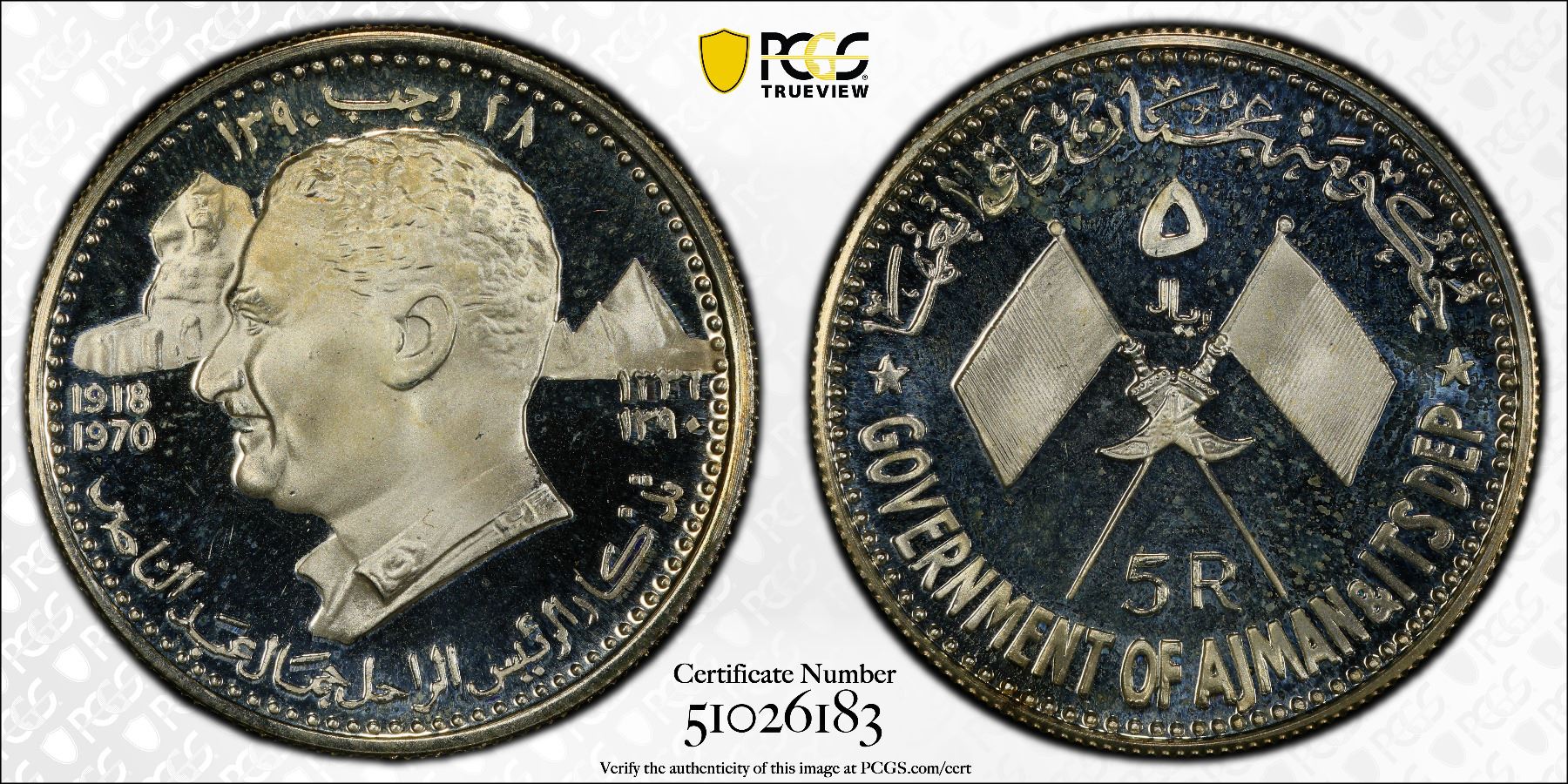 AJMAN: Rashid Bin Hamad al-Naimi, 1928-1981, AR 5 riyals, 1970/AH1390, PCGS PF67 Deep Cameo