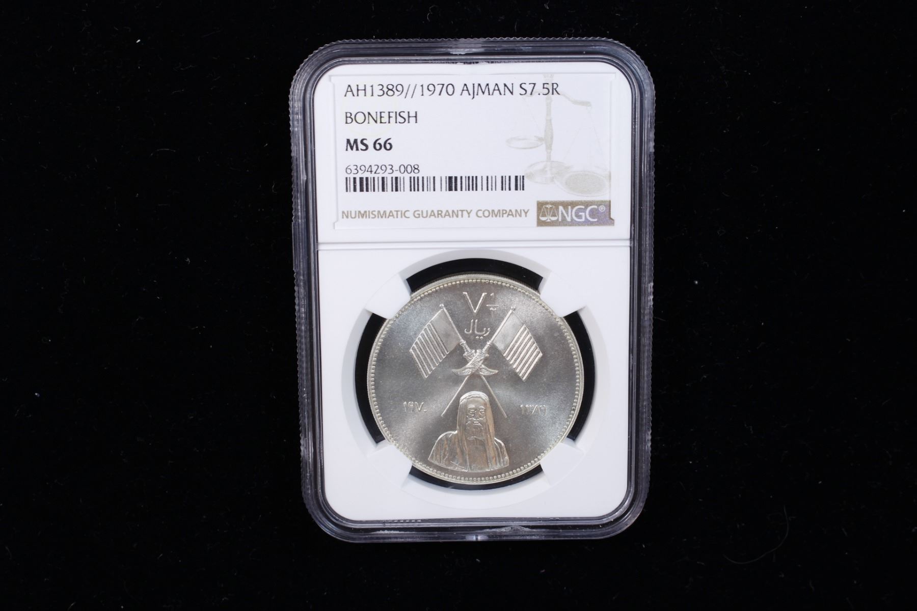 AJMAN: Rashid Bin Hamad al-Naimi, 1928-1981, AR 7½ riyals, 1970/AH1389, KM-5, Bonefish, blast white luster, mintage of only 4,350 pieces, NGC graded MS66.