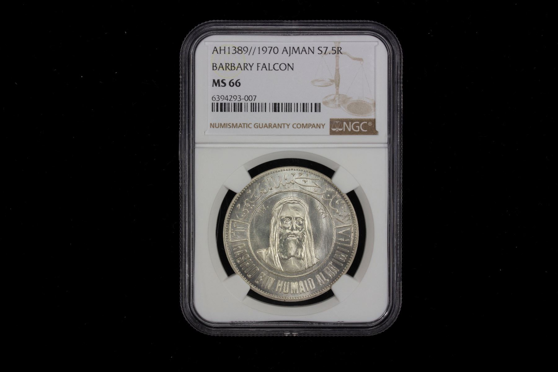 AJMAN: Rashid Bin Hamad al-Naimi, 1928-1981, AR 7½ riyals, 1970/AH1389, KM-6, Barbary Falcon, blast white luster, mintage of only 4,350 pieces, NGC graded MS66.