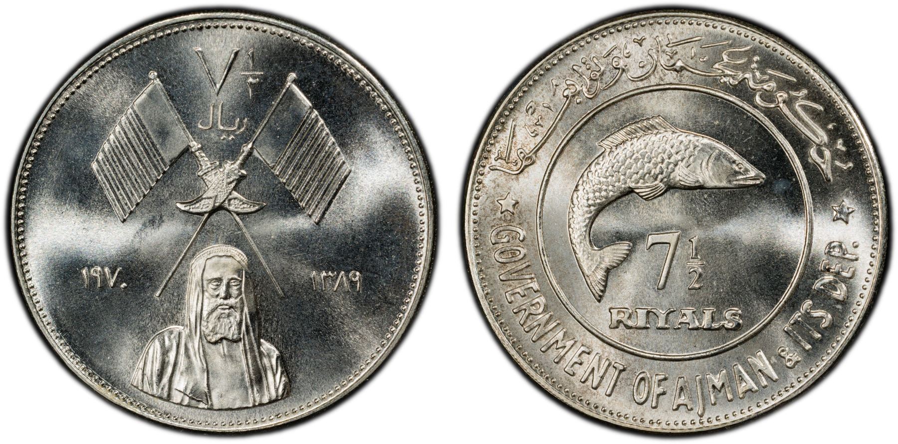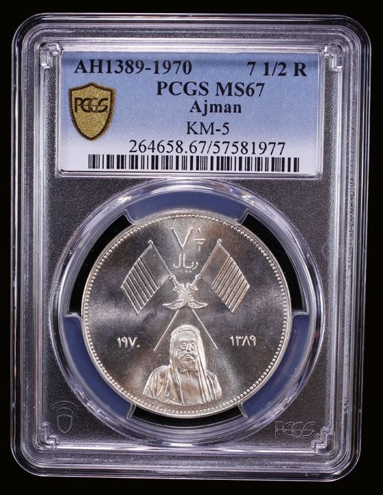 AJMAN: Rashid Bin Hamad al-Naimi, 1928-1981, AR 7½ riyals, 1970/AH1389, PCGS MS67