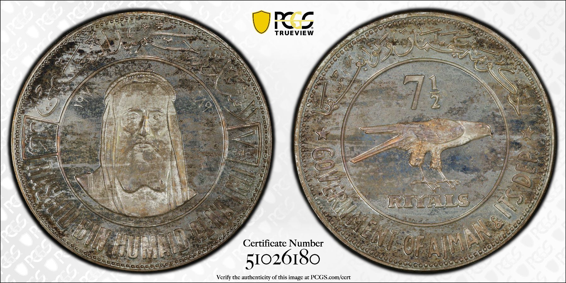 AJMAN: Rashid Bin Hamad al-Naimi, 1928-1981, AR 7½ riyals, 1970/AH1389, PCGS PF66 Cameo