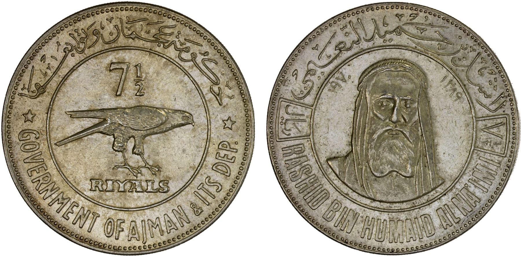 AJMAN: Rashid Bin Hamad al-Naimi, 1928-1981, AR 7½ riyals, 1970/AH1389, Unc