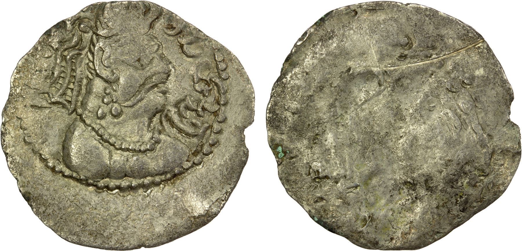ALCHON HUNS: Lakhana Udayaditya, ca. 490s, AR drachm (3.61g), G-79, king's bust right, ruler's name around // fire altar flanked by attendants; off-center strike, VF, RRR.
