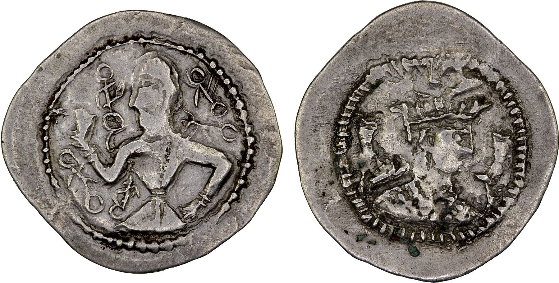 ALCHON HUNS: Proper Hephthalites, ca. 475-550, AR drachm (4.04g), G-E25, Vondrovec-287A/B, cf. Zeno-42957 for further information, Sasanian-style bust right, probably derived from Kavad I (484-497, 499-531) with one Bactrian word before // half portrait left, raising a cup (of wine?) with his right hand, his left hand akimbo, Sogdian words in the field, assigned to a theoretical "King of Hyons"; VF, ex Dr. Dirk Löer Collection. A similar piece sold in our Auction 46, lot 95.
